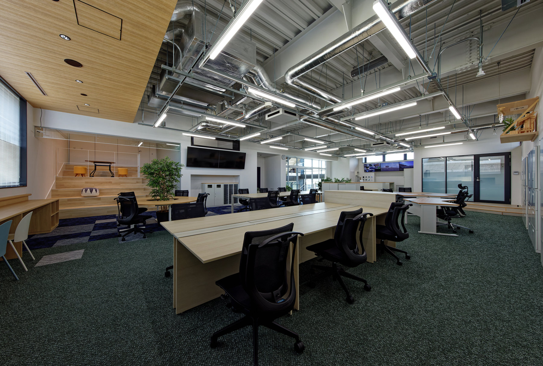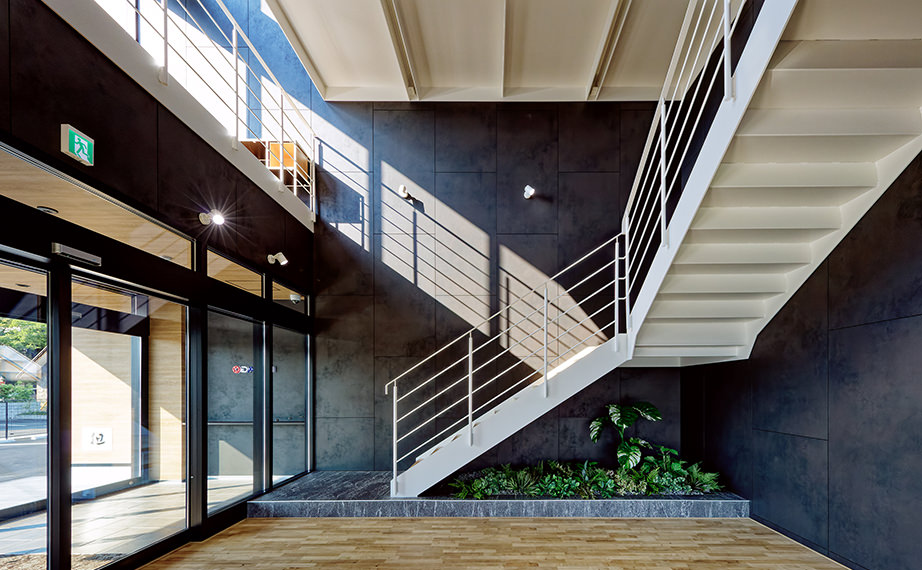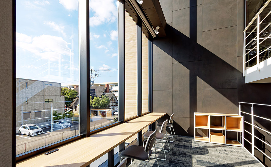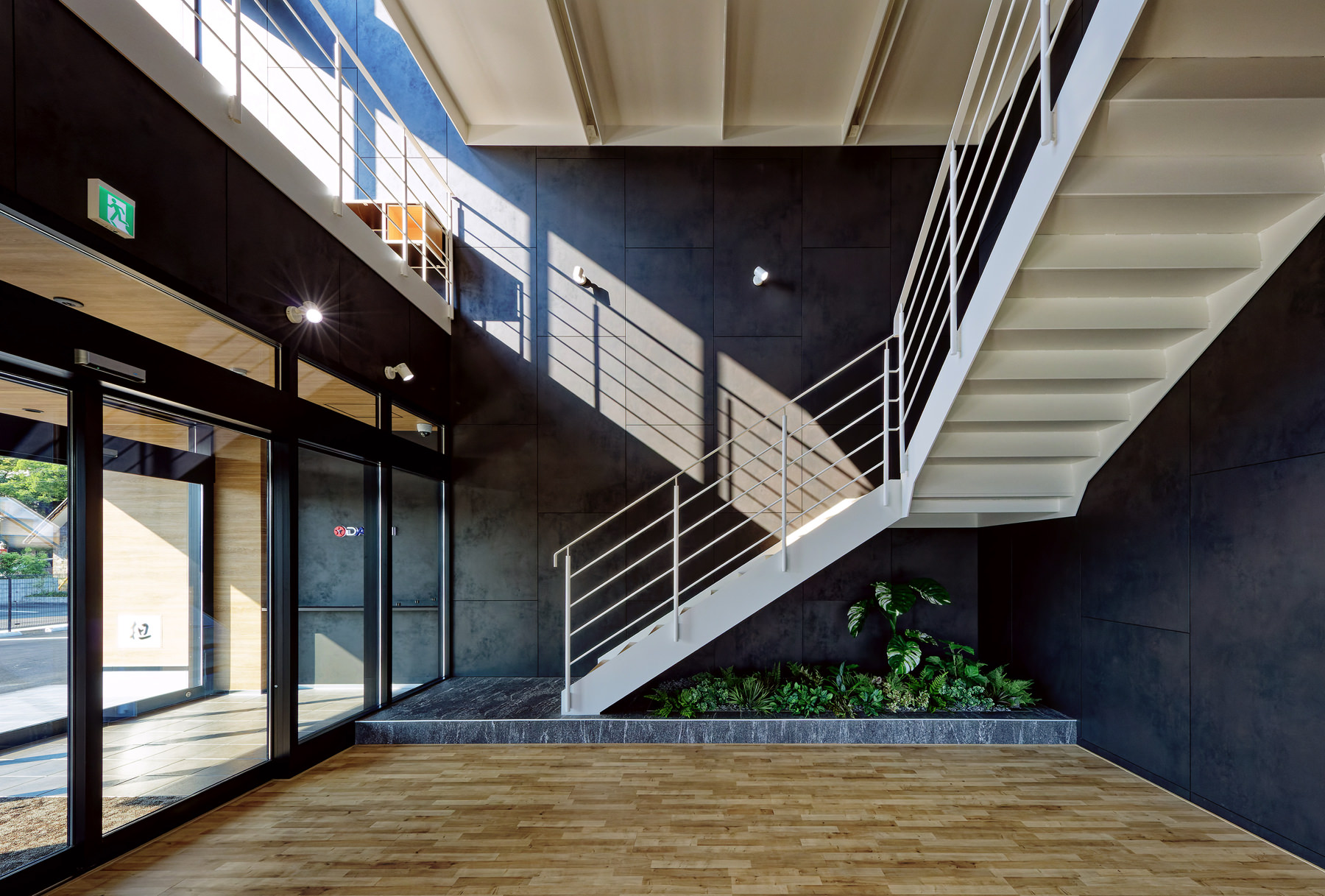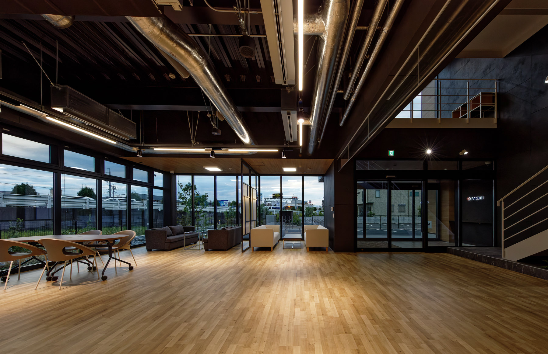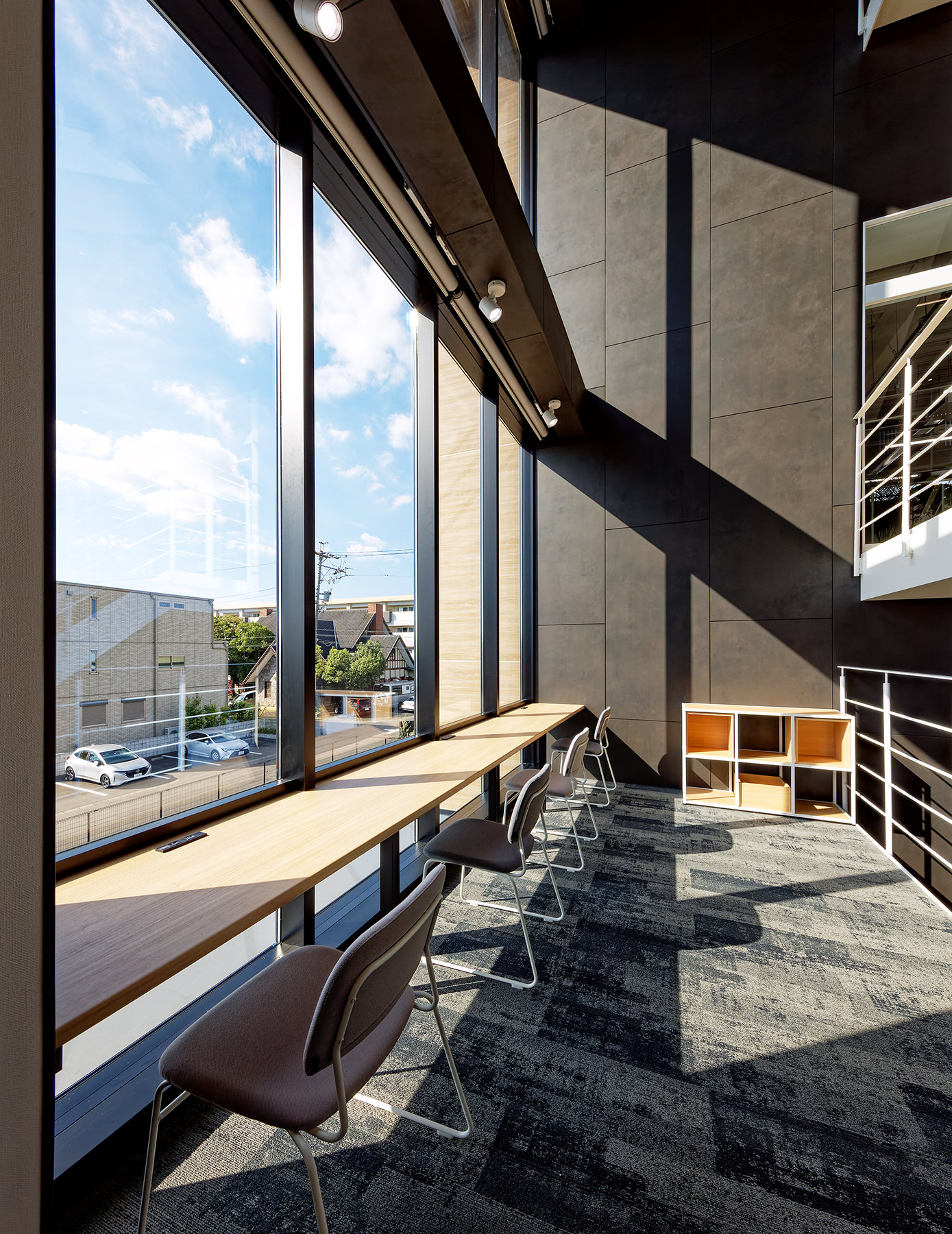施主は空調・換気等の設計施工を行う会社であり、企業発展の起点になることを目指した建築計画です。吹抜とスキップフロアを設けることで従業員同士の交流促進や、空気・熱の流れを利用した「ZEB」設計を実現しました。