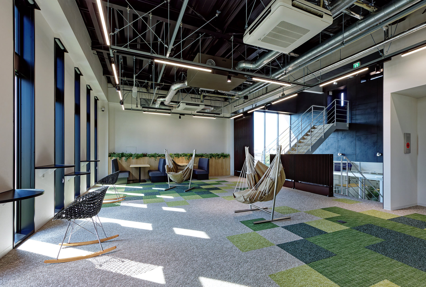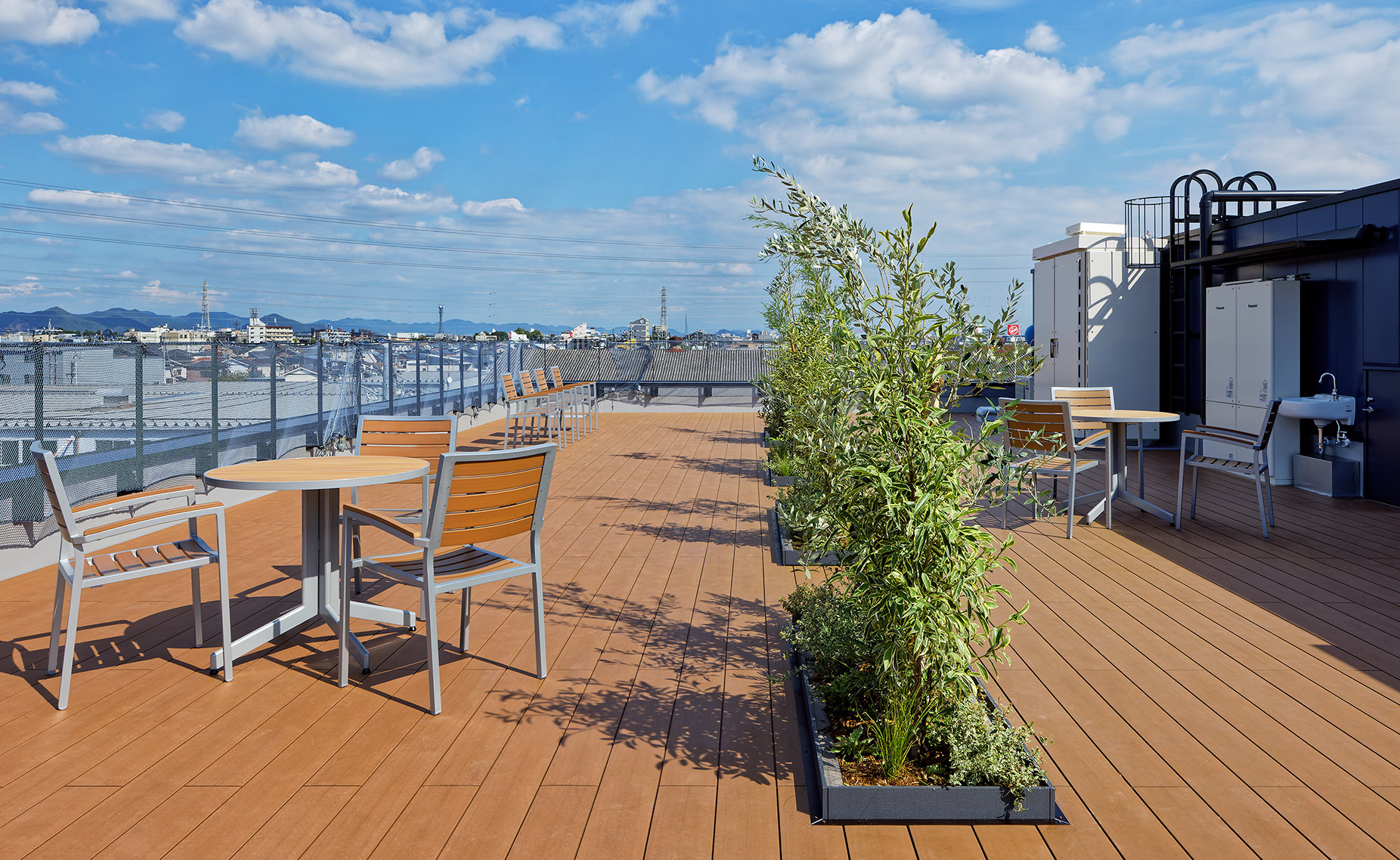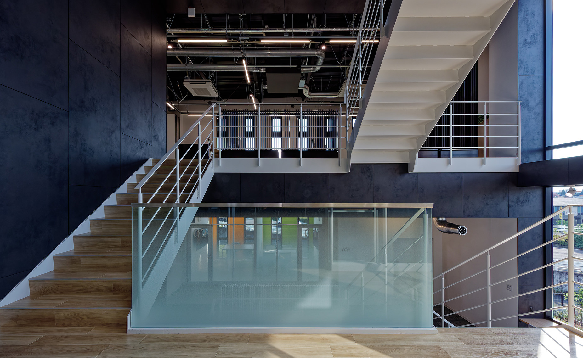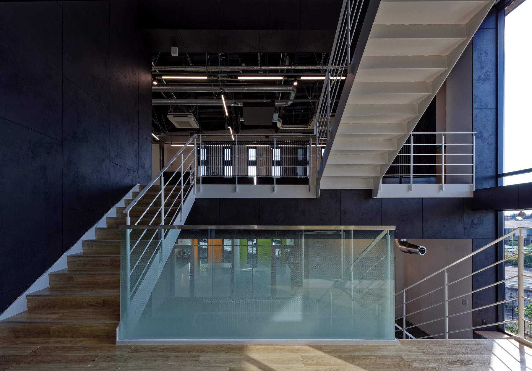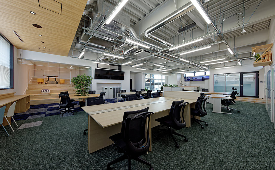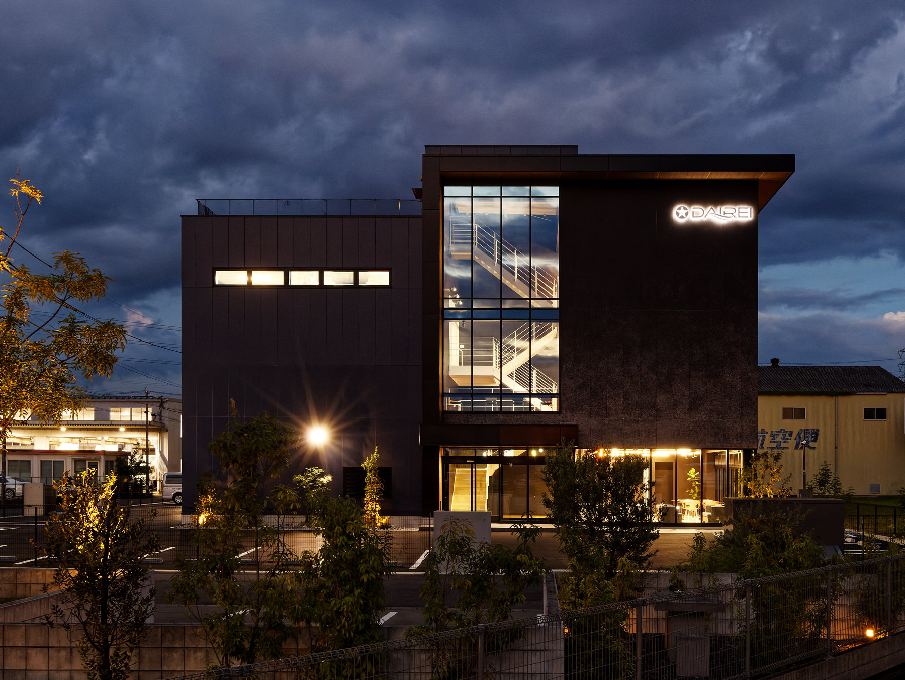 施主は空調・換気等の設計施工を行う会社であり、企業発展の起点になることを目指した建築計画です。吹抜とスキップフロアを設けることで従業員同士の交流促進や、空気・熱の流れを利用した「ZEB」設計を実現しました。