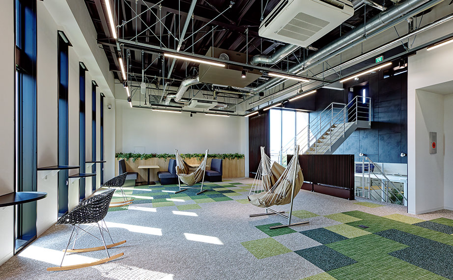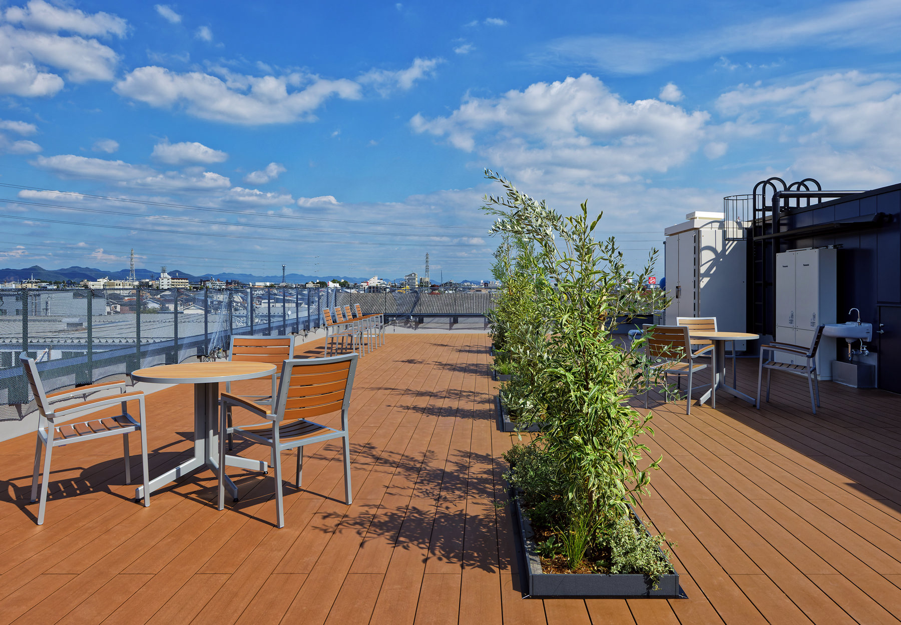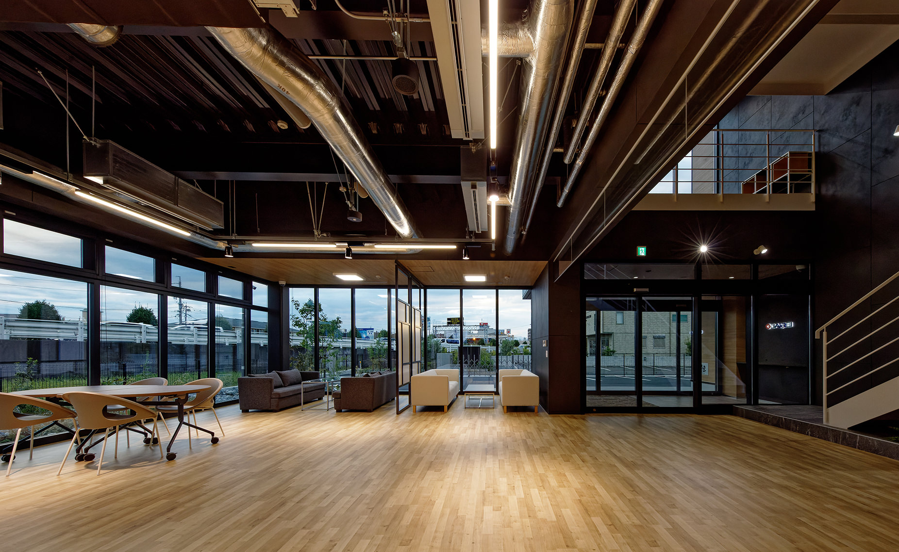 敷地は国道沿いであるため、国道側にインパクトを与えるよう、空気・熱の流れをイメージしたデザインとしました。また、来訪者への技術アピールや社員教育のため、内部空間は天井スケルトンとし、設備機器や鉄骨構造を魅せるデザインとしています。