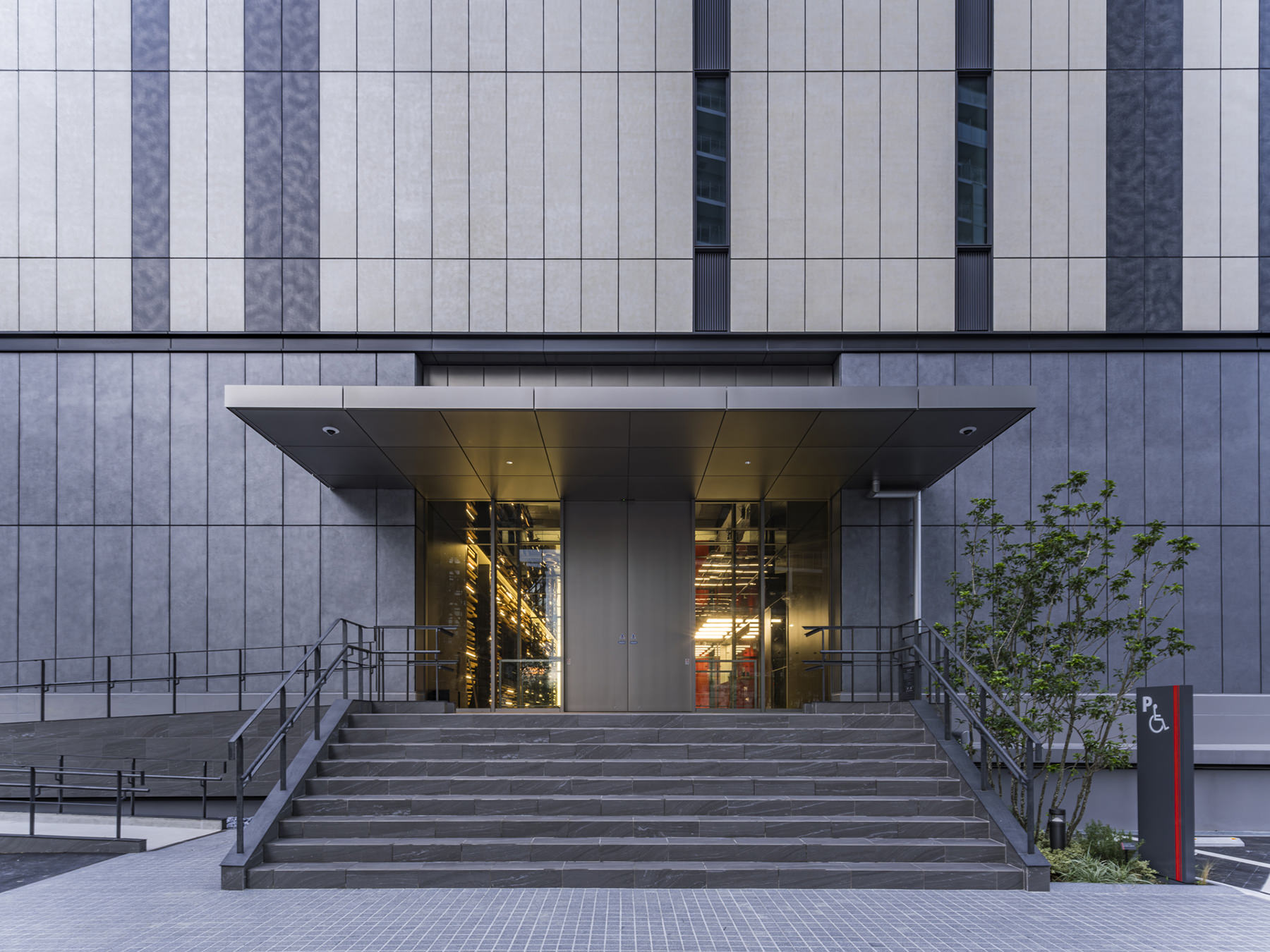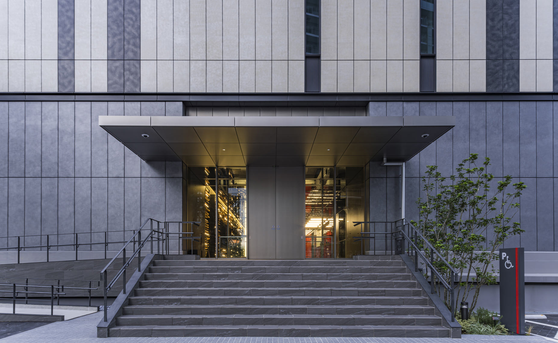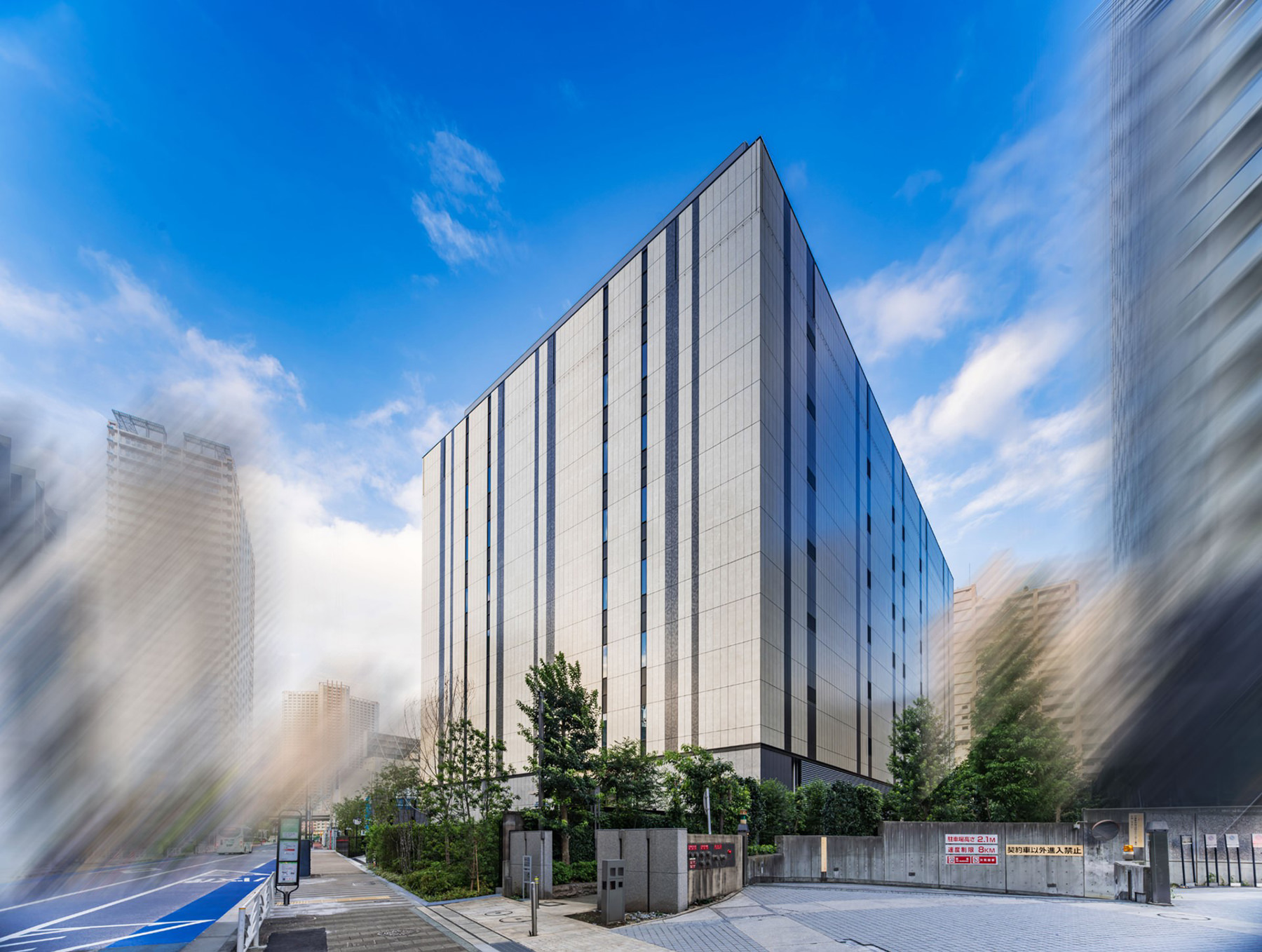 この施設は、都市部に位置する建築物として周辺環境との調和を図るため、外観デザインにはアースカラーを基調とした特殊塗装を施しています。これにより、周辺の景観との一体感を形成し、都市の美観を損なうことなく存在感を示します。