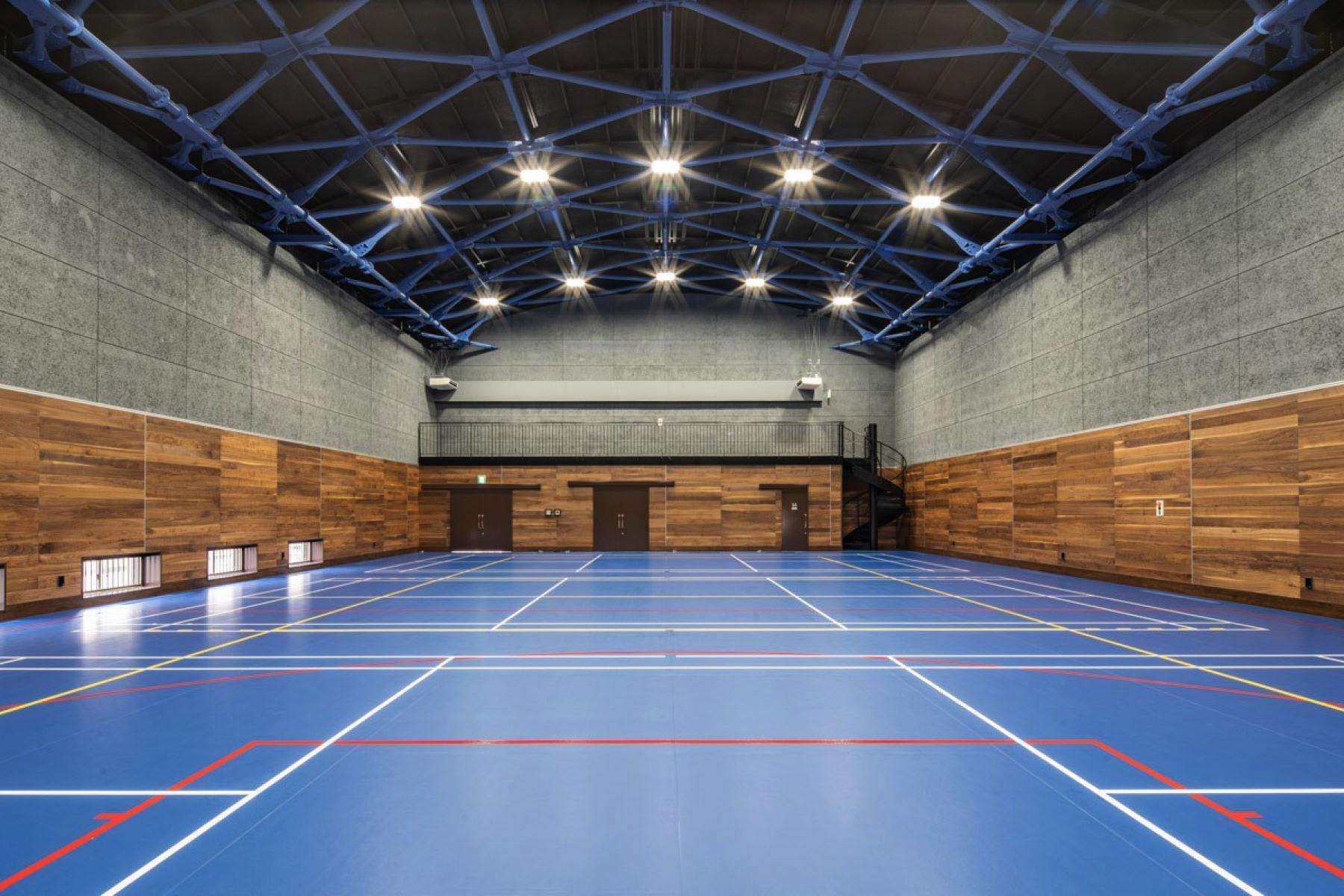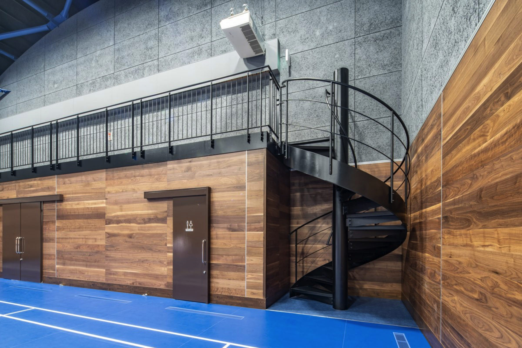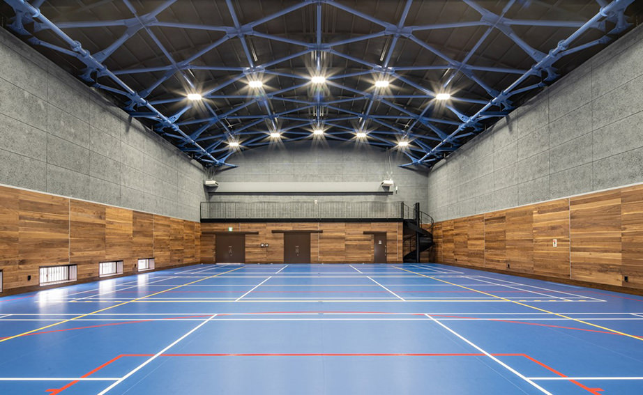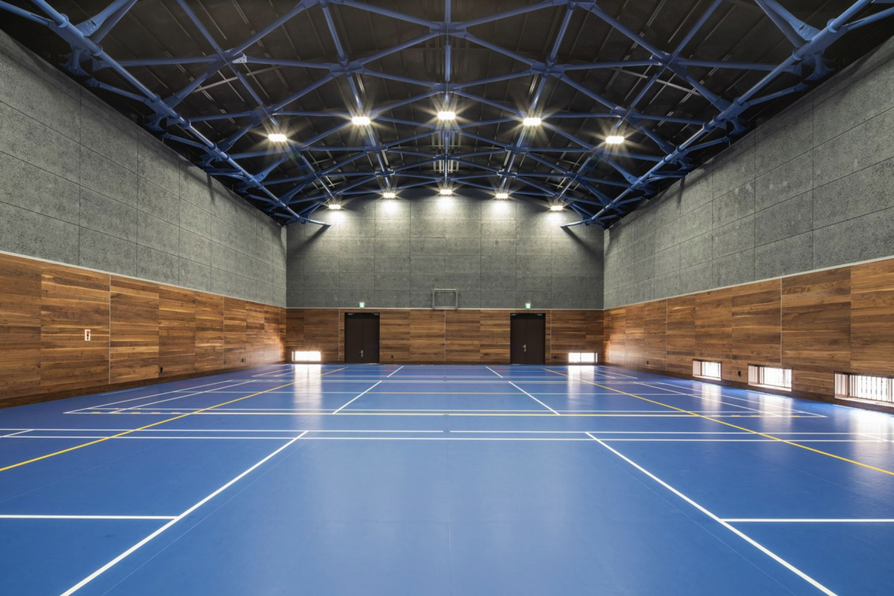 内装について木材を取り入れ、油山の自然を感じるデザインとしただけでなく、色はバドミントンシャトルが周囲と同化しない色にすると同時に、体育館内が暗い印象とならない様に、選手と確認をしながら色の調整をしました。