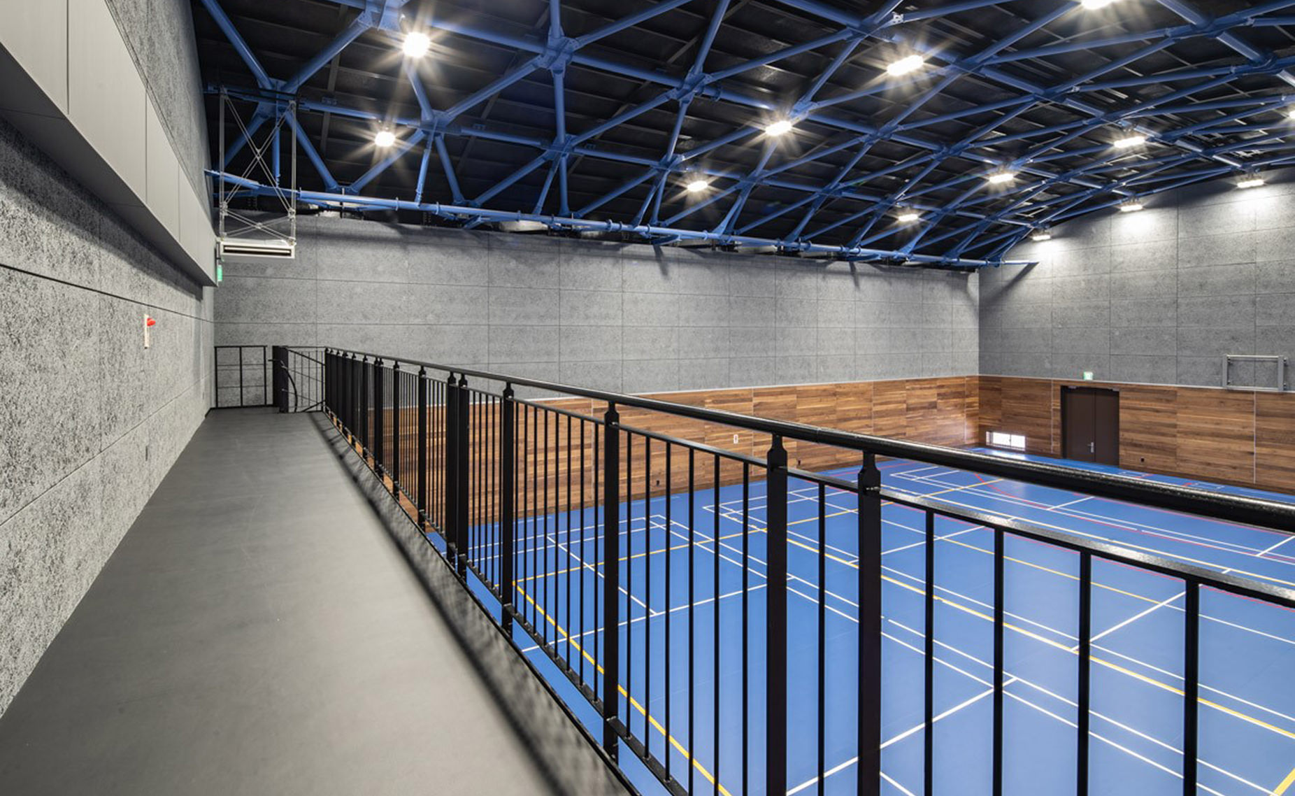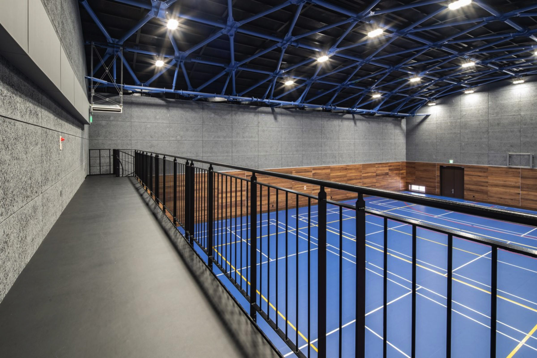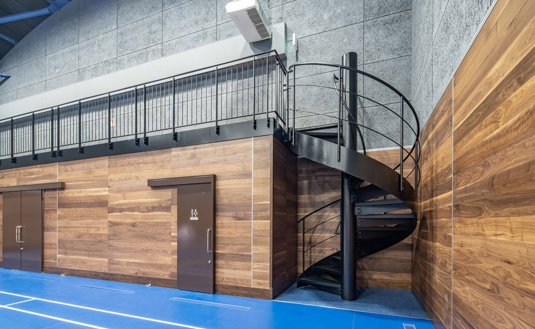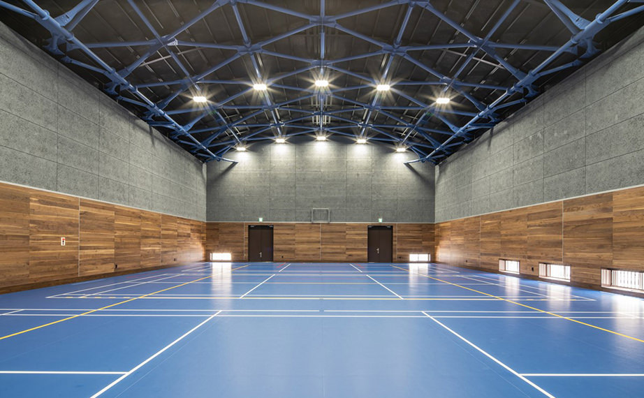 内装について木材を取り入れ、油山の自然を感じるデザインとしただけでなく、色はバドミントンシャトルが周囲と同化しない色にすると同時に、体育館内が暗い印象とならない様に、選手と確認をしながら色の調整をしました。