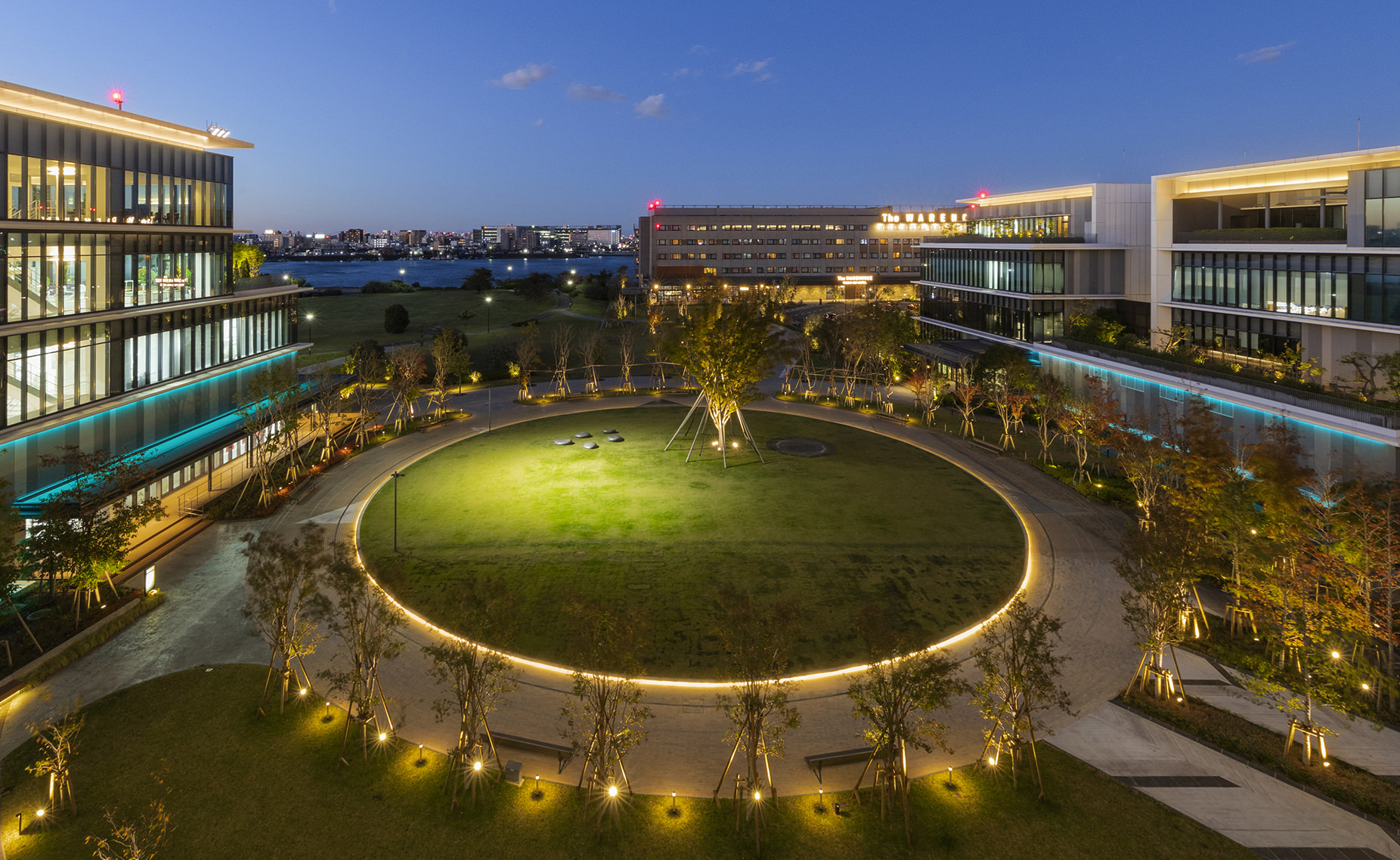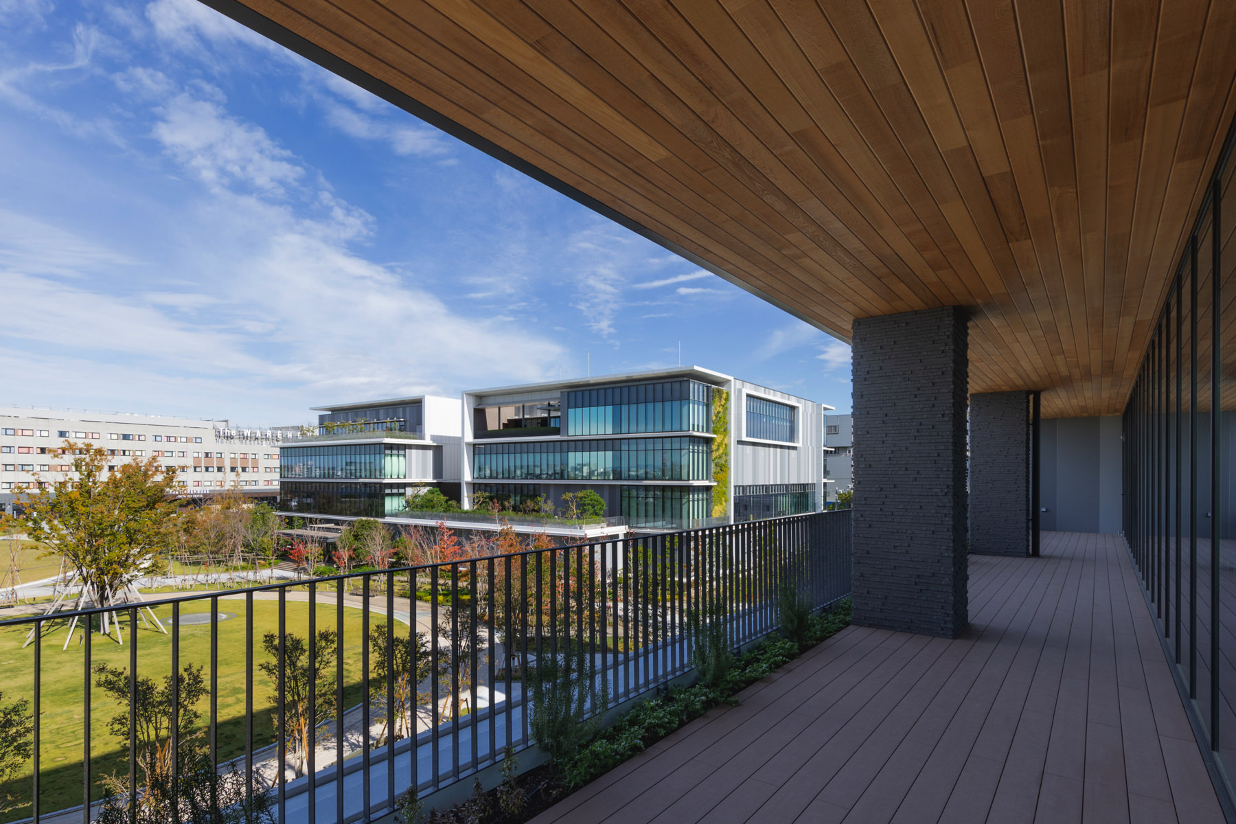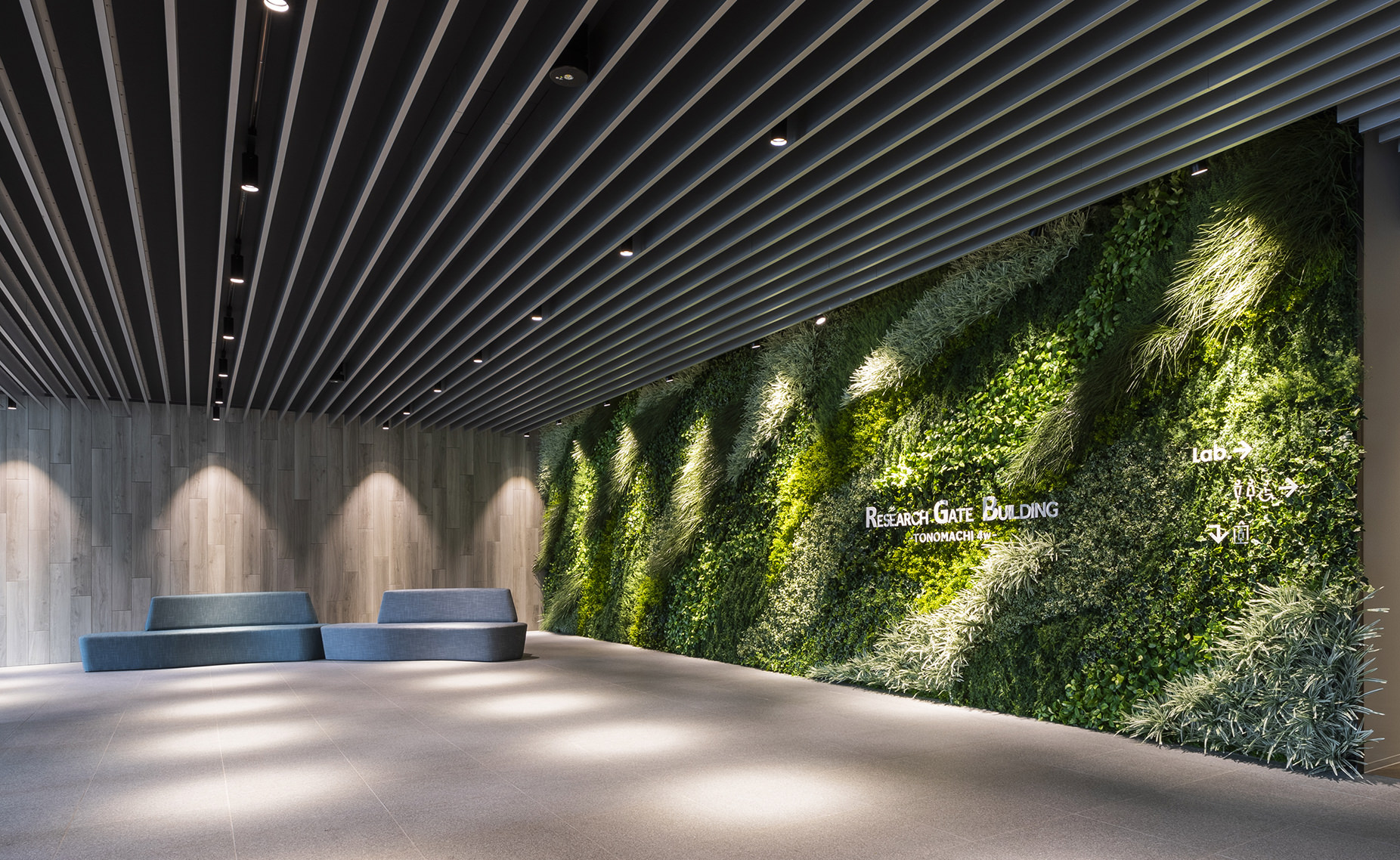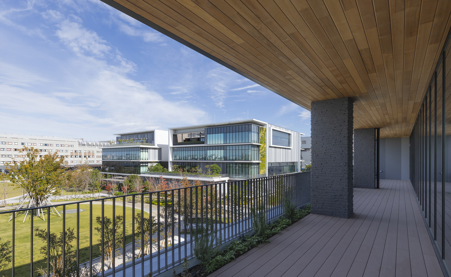 ライフサイエンス・環境分野における研究開発を行う国際戦略拠点「殿町三丁目A地区(キングスカイフロント)開発」における最終プロジェクト。周辺道路からセンターサークルへと導く外構ピロティ・建物形状・テラスによって、利用者が集う場としての外構ランドスケープデザインを行いました。建物中央部に街区の軸線を引込んだピロティ・光庭・ラウンジを計画。ラウンジ内には集う場としてのソファ等の什器、外構と呼応する様な擬木植栽を計画し、閉鎖しがちな研究施設においても自然を感じ交流が生まれる様な空間設計を考えました。