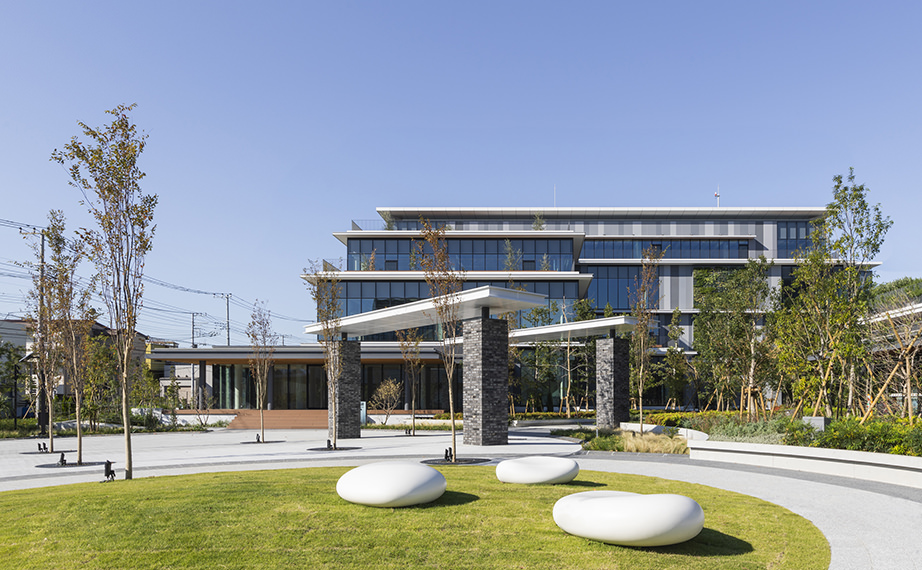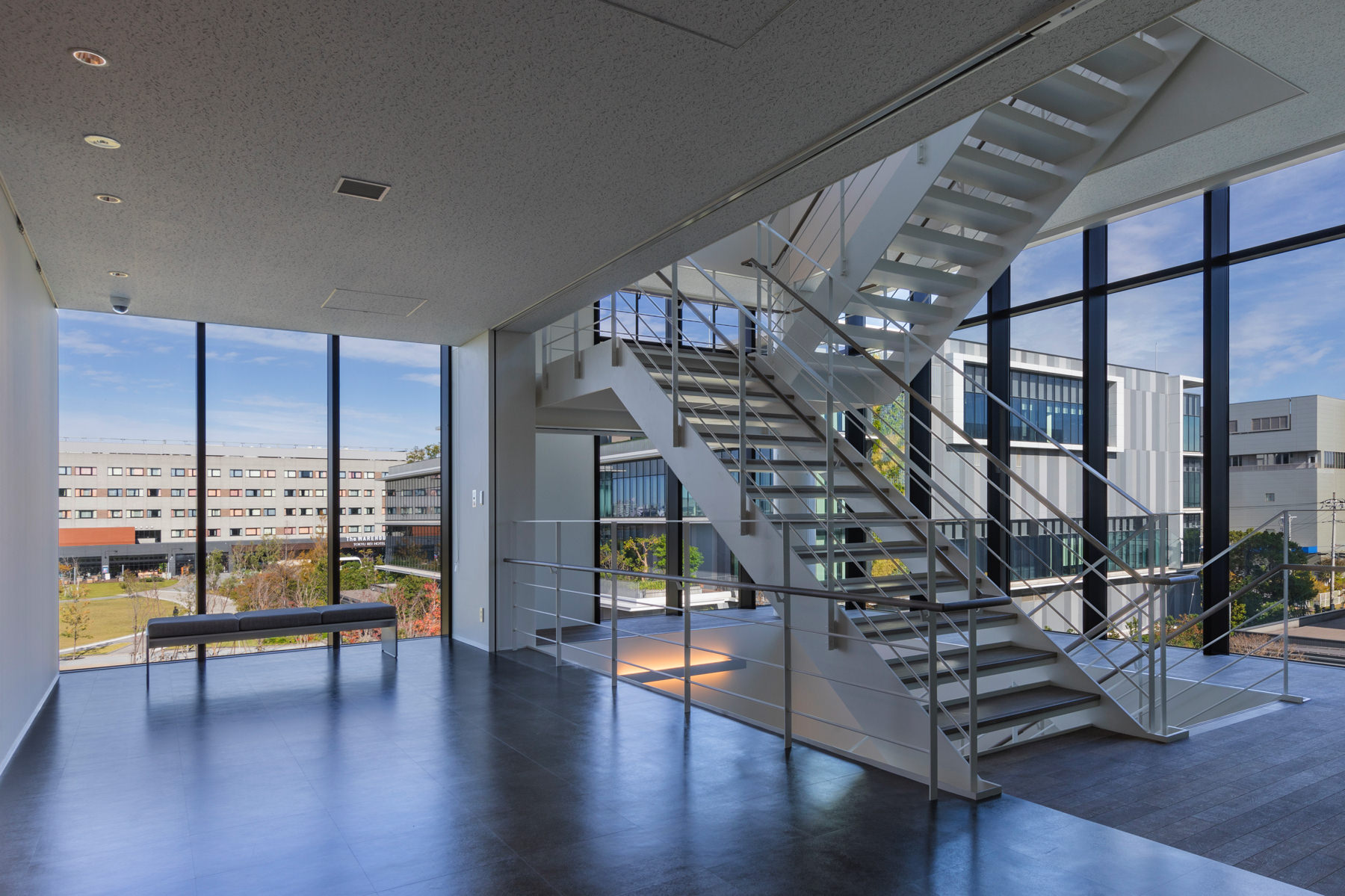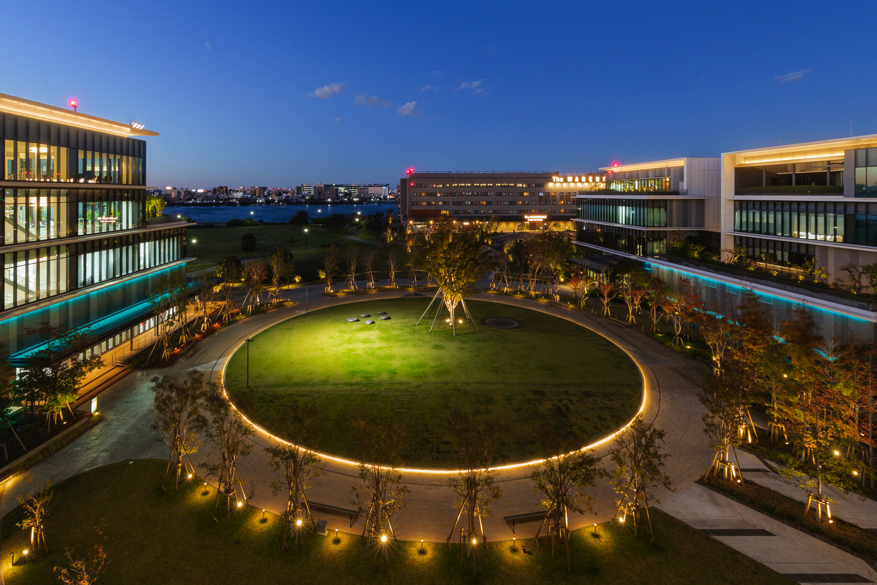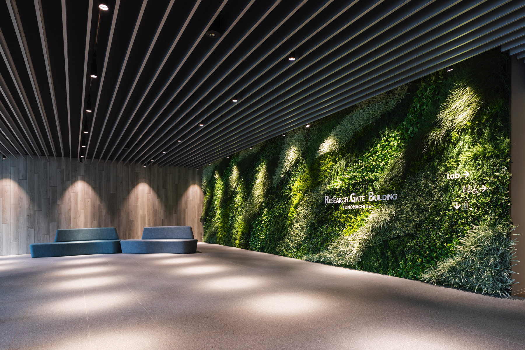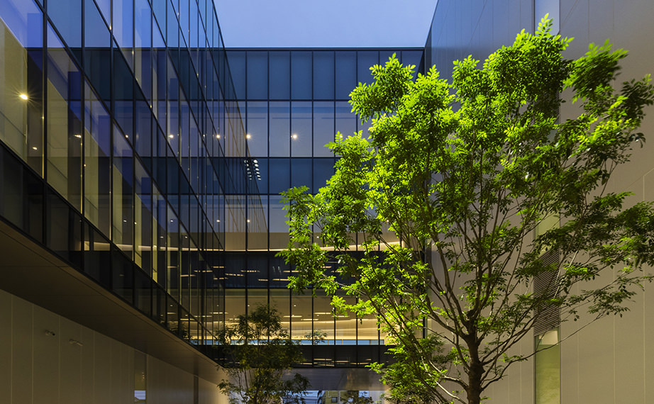 ライフサイエンス・環境分野における研究開発を行う国際戦略拠点「殿町三丁目A地区(キングスカイフロント)開発」における最終プロジェクト。周辺道路からセンターサークルへと導く外構ピロティ・建物形状・テラスによって、利用者が集う場としての外構ランドスケープデザインを行いました。建物中央部に街区の軸線を引込んだピロティ・光庭・ラウンジを計画。ラウンジ内には集う場としてのソファ等の什器、外構と呼応する様な擬木植栽を計画し、閉鎖しがちな研究施設においても自然を感じ交流が生まれる様な空間設計を考えました。