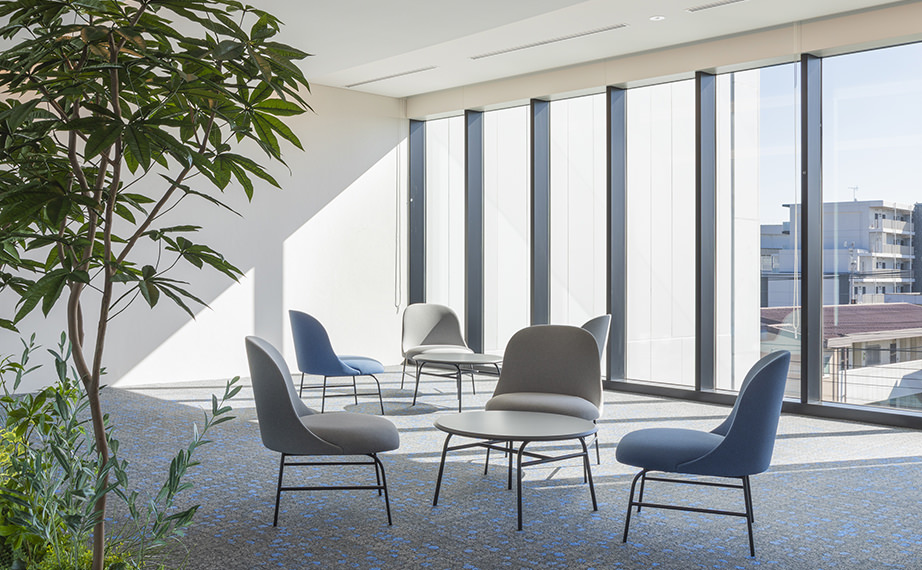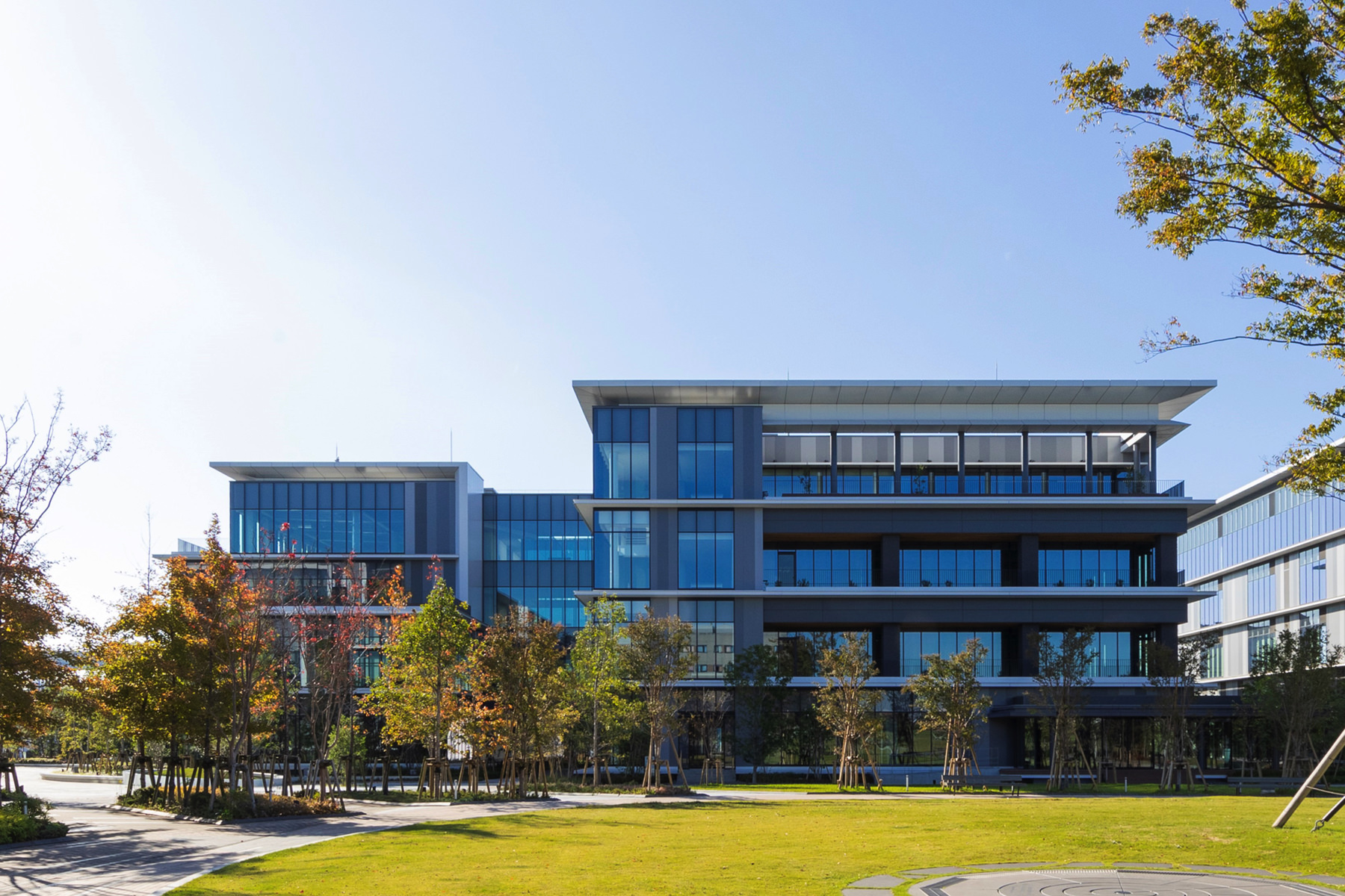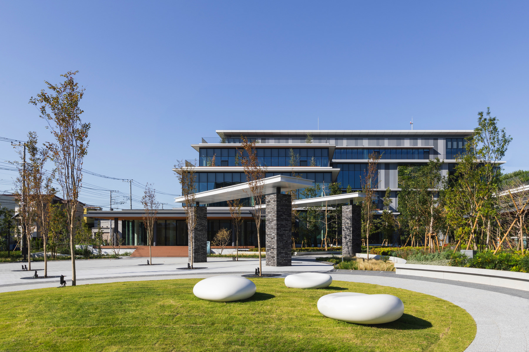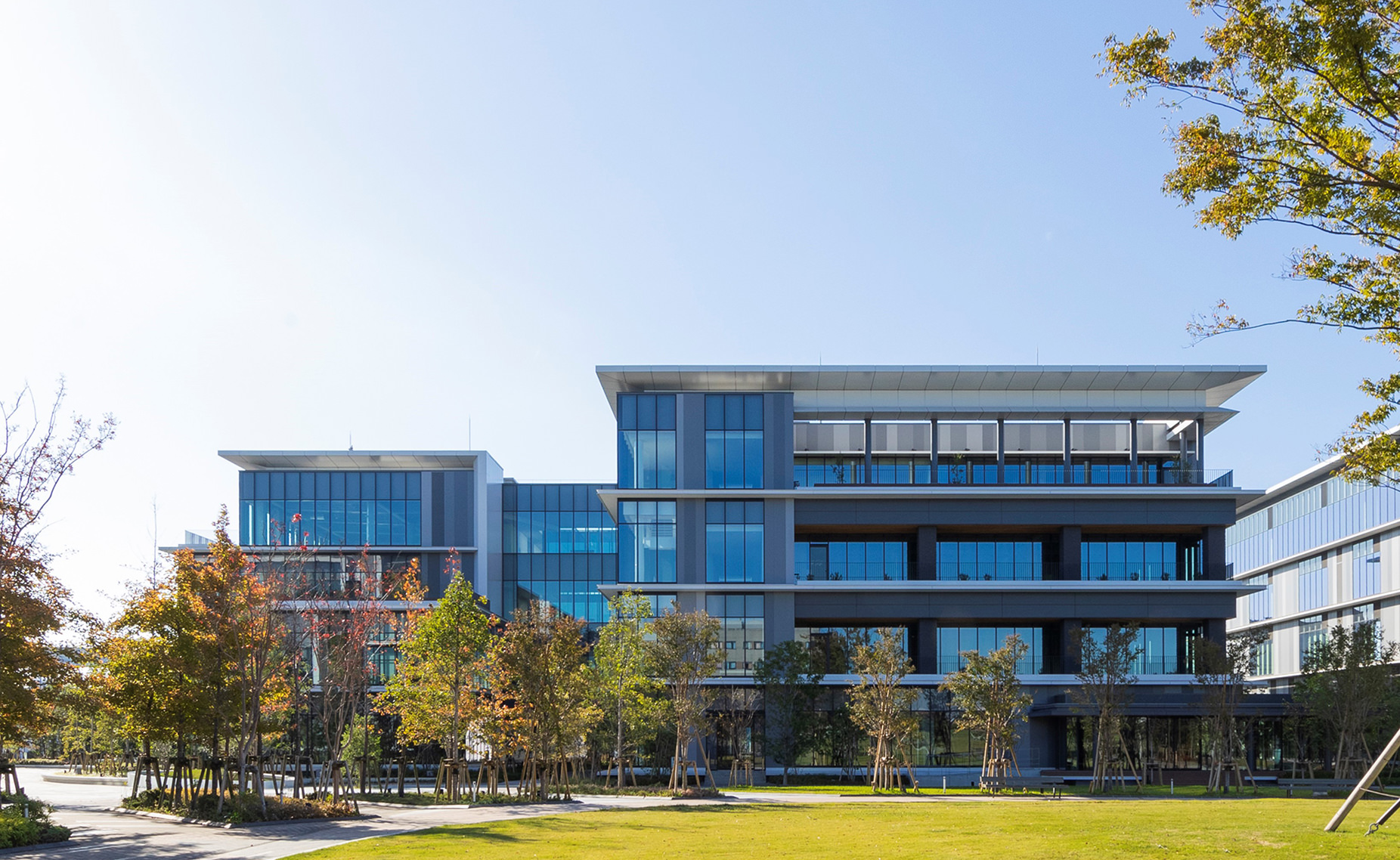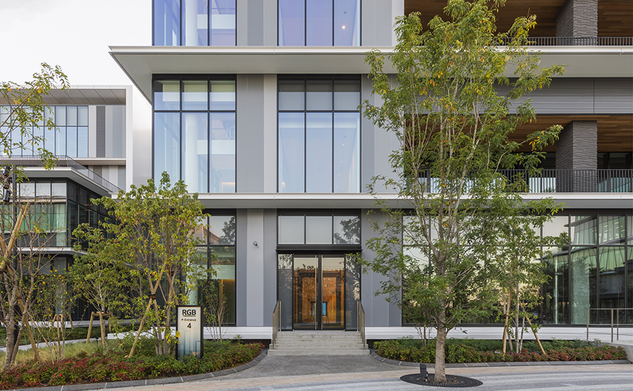 ライフサイエンス・環境分野における研究開発を行う国際戦略拠点「殿町三丁目A地区(キングスカイフロント)開発」における最終プロジェクト。周辺道路からセンターサークルへと導く外構ピロティ・建物形状・テラスによって、利用者が集う場としての外構ランドスケープデザインを行いました。建物中央部に街区の軸線を引込んだピロティ・光庭・ラウンジを計画。ラウンジ内には集う場としてのソファ等の什器、外構と呼応する様な擬木植栽を計画し、閉鎖しがちな研究施設においても自然を感じ交流が生まれる様な空間設計を考えました。