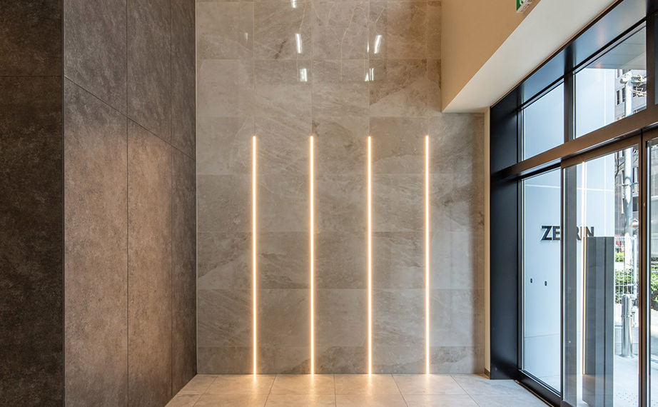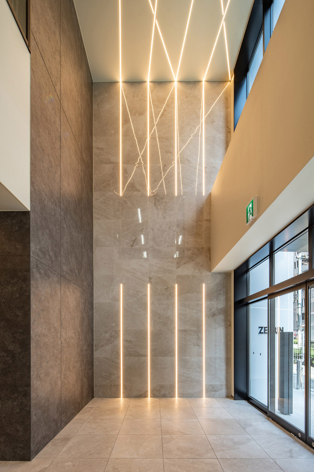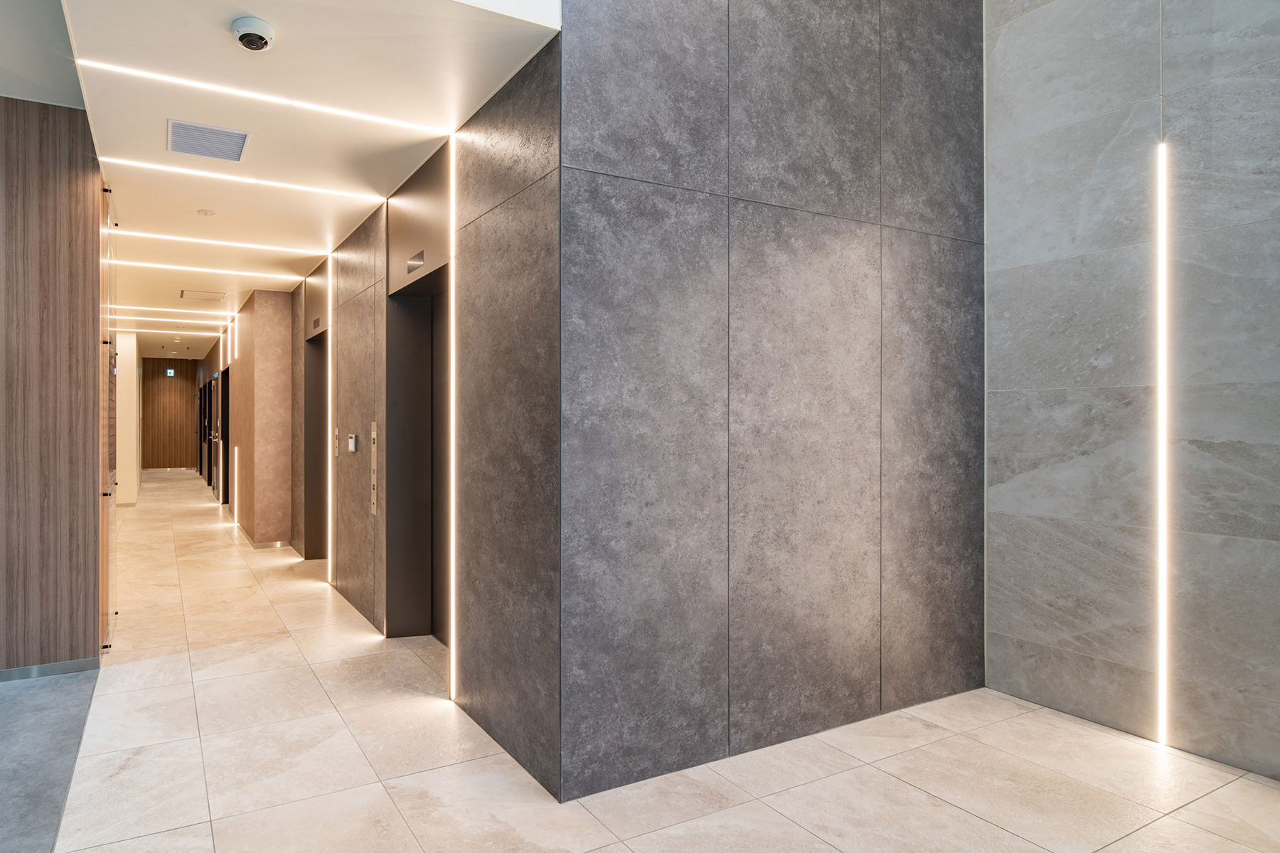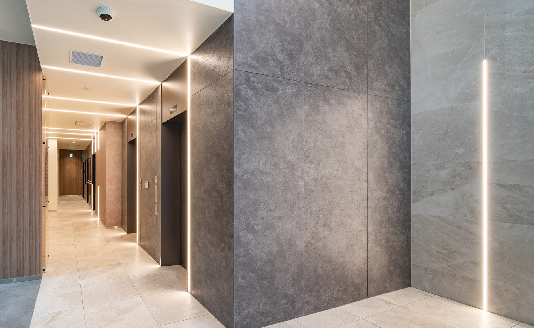 外観に仕様したデザインパネルは、リブの厚みが異なるものをランダムに貼り、同じ色でも色の濃淡が出ることによって奥行きのある洗練された装いとしました。また、デザインパネルの面を白のフレームでL字に囲うことで、全体的に引き締まりスタイリッシュにまとめました。メインエントランスは、2層に渡る吹き抜け空間となっており、ライン照明を使って外観のL字のフレームを表現しました。そのライン照明はエントランス奥のEVホールへと続いていき、外観デザインを内装にもさりげなく取り入れました。