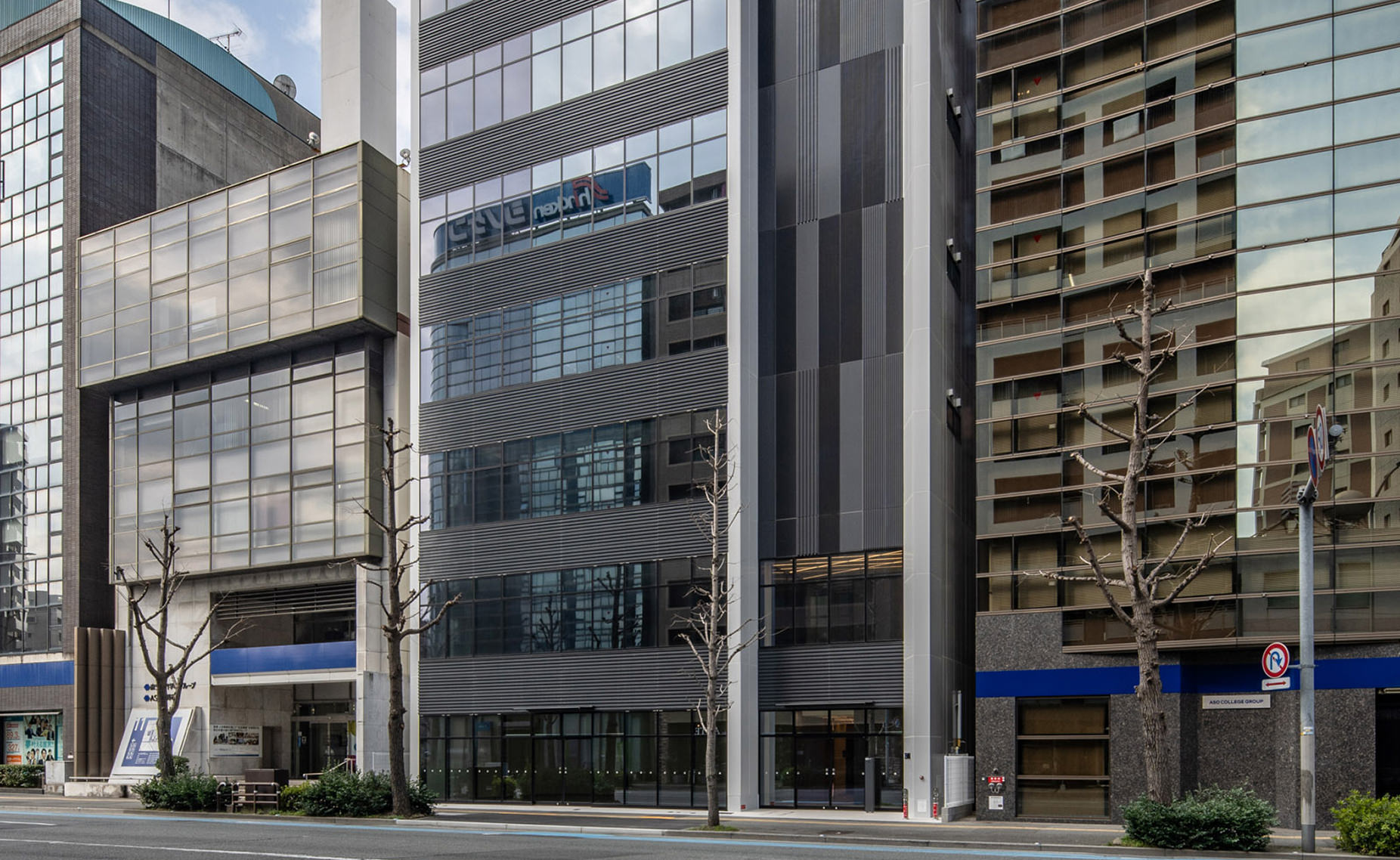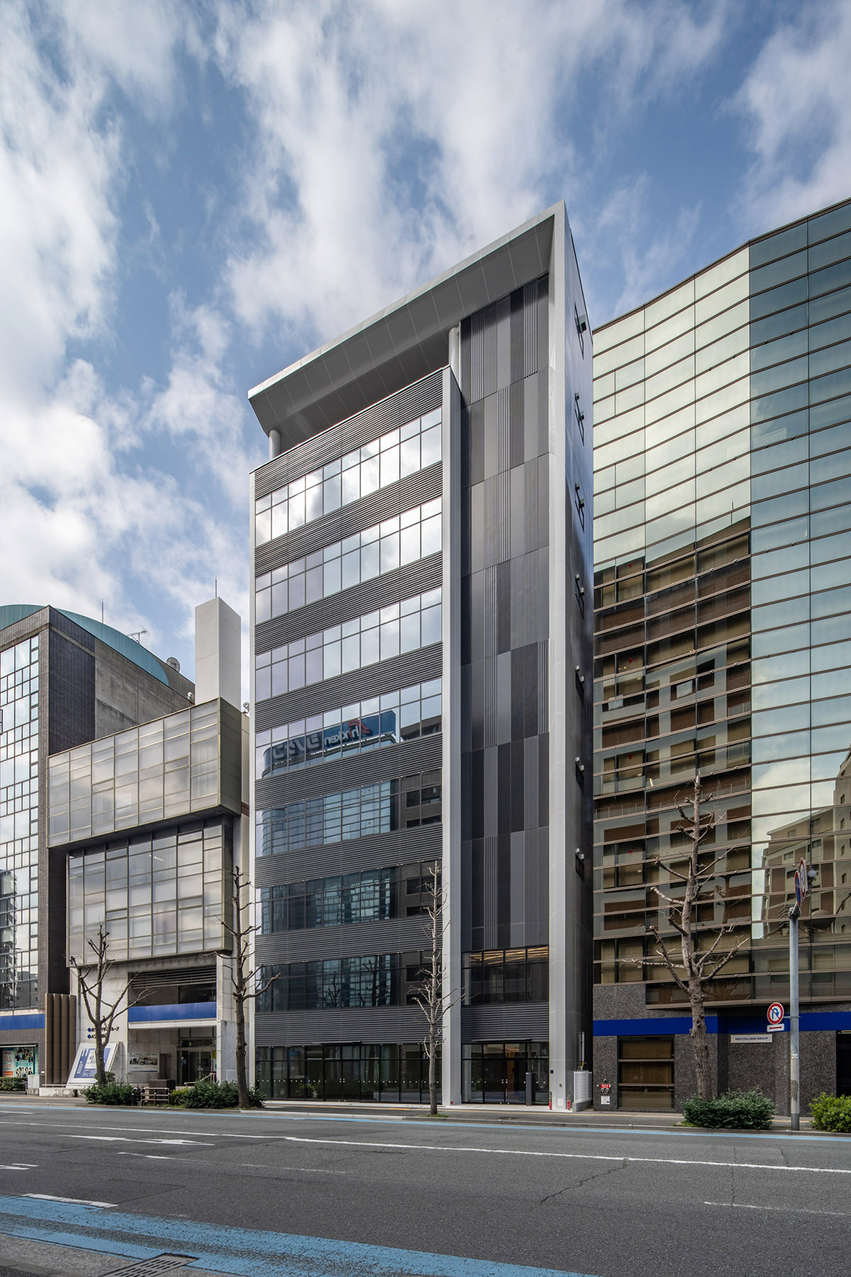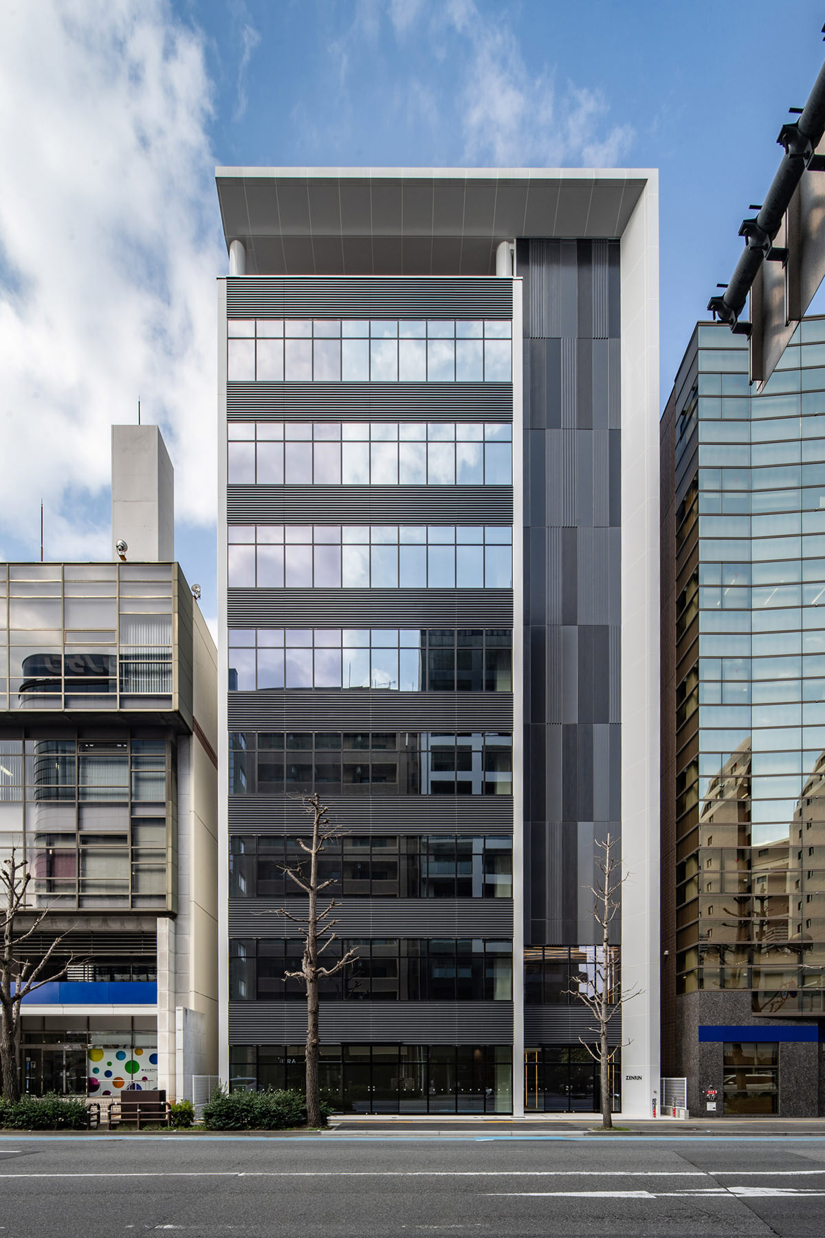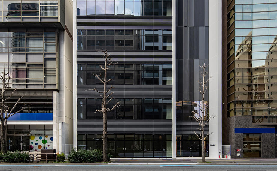 外観に仕様したデザインパネルは、リブの厚みが異なるものをランダムに貼り、同じ色でも色の濃淡が出ることによって奥行きのある洗練された装いとしました。また、デザインパネルの面を白のフレームでL字に囲うことで、全体的に引き締まりスタイリッシュにまとめました。メインエントランスは、2層に渡る吹き抜け空間となっており、ライン照明を使って外観のL字のフレームを表現しました。そのライン照明はエントランス奥のEVホールへと続いていき、外観デザインを内装にもさりげなく取り入れました。