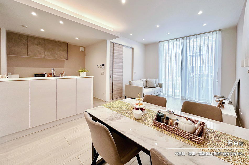 1F天井高2m72cmの開放的な空間に、東から光を取り込むリビングハイサッシ。 夜はコーブ照明が穏やかな雰囲気をつくり、家族の時間をやさしく包みます。 洗面と脱衣を分けた使いやすい水まわりも、暮らしに心地よさをプラス。 家族の生活リズムを大切にした水まわり設計です。 高さ・明るさ・動線。住み心地を左右するポイントにしっかりこだわった住まいです。