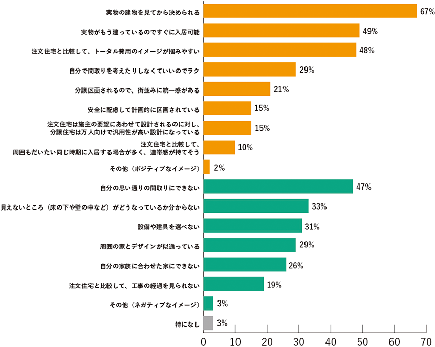 「分譲住宅」に抱くイメージとして、ポジティブなもの・ネガティブなものをそれぞれ聞いてみました。ポジティブなイメージの最多は「実物の建物を見てから決められる」(67%)で、次に多かったのが「実物がもう建っているのですぐに入居可能」(49%)、「注文住宅と比較してトータル費用のイメージが掴みやすい」(48%)と続きました。すでに完成している実物を確認できること、契約から入居までのタイムラグが少ないこと、住宅価格が明確であることが魅力と捉えられているようです。また、統一感のある街並みや全体計画など、注文住宅とは違った部分を魅力として挙げる声もありました。
