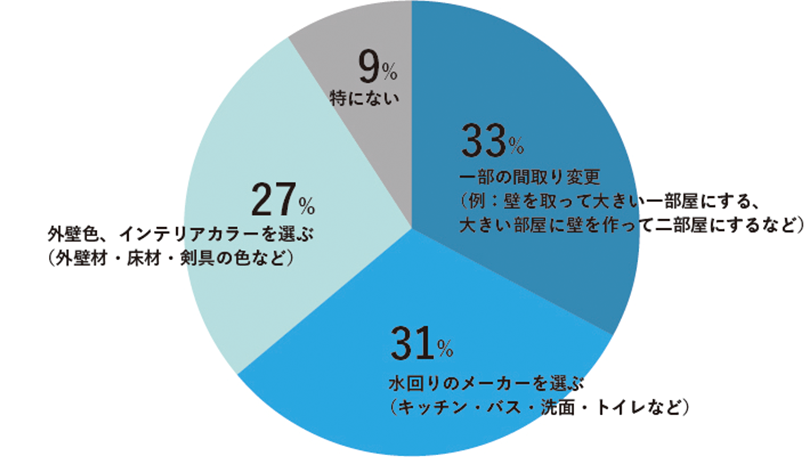 分譲住宅でも一部の間取り変更や、設備や内装を選んでこだわりを反映できるケースもあります。アンケートでは9割の人が何らかのこだわりを反映させたいと回答。こだわりたい部分に対しては「一部の間取り変更」(33%)、「水回りのメーカーを選ぶ」(31%)、「外壁色、インテリアカラーを選ぶ」(27%)と、回答が割れました。