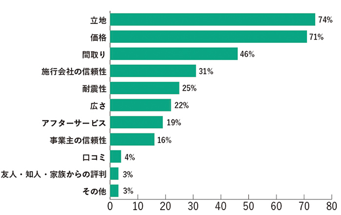 「立地」(74%)、「価格」(71%)の回答が多くを占め、次に「間取り」(46%)、「施工会社の信頼性」(31%)と続きました。