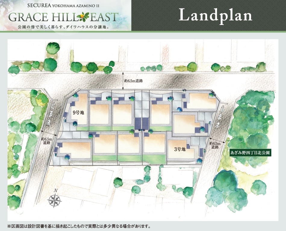 公園の傍で美しく暮らす。※あざみ野四丁目北公園が分譲地東側道路に隣接。