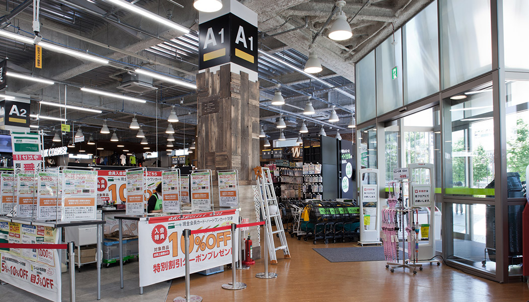 ロイヤルホームセンターでは2013年より新店舗のZEB化を推進しています。当店舗では省エネにつながる自然採光システムと照明コントロール、空調冷却器と高効率空調器を採用し、ZEB Ready(※1)を実現しました。また、太陽光発電設備(20.4kW)により発電した電力を自家消費しています。