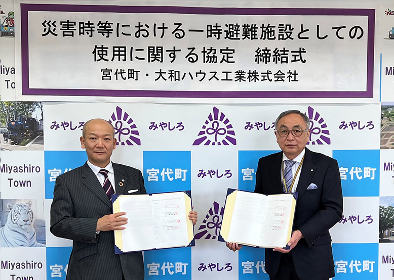 2022年11月に竣工したマルチテナント型物流施設「DPL久喜宮代」は、万が一地震が発生しても、建物の機能を維持し、荷物や設備のダメージを最小限に抑え、働く人たちに安全・安心を提供する免震システムや浸水対策を備えています。この防災機能を生かして埼玉県宮代町と大和ハウス工業株式会社は、2023年1月17日、「災害時等における一時避難施設としての使用に関する協定書」を締結しました。