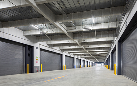 また、車両・荷捌きのオペレーションの効率化を図るために、天候の影響を受けずに荷物の積み下ろしができる「中車路」を採用。これにより、風雨などから荷物やドライバー、従業員を守ります。また、らせん状のランプウェイ2基(ダブルランプウェイ)によって、40フィートコンテナ車が各階に直接乗り入れることができ、施設全体で374台分のトラックバースも用意しています。