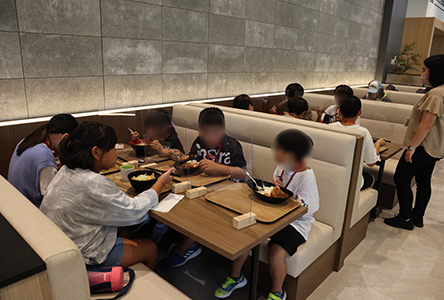 地域の方とのふれあい、コミュニティづくりにおいても、大和ハウスグループとしてさまざまな取り組みを行っています。例えば、「こどもエコ・ワークショップ」というイベントでは、地域の子どもたち向けに物流施設と触れ合うワークショップを開き、施設を見学しながら物流の流れを学べる場を提供しました。地域の方にもご利用いただける施設内のレストランにて、子どもたちと共に昼食を食べ、懇親を深めました。