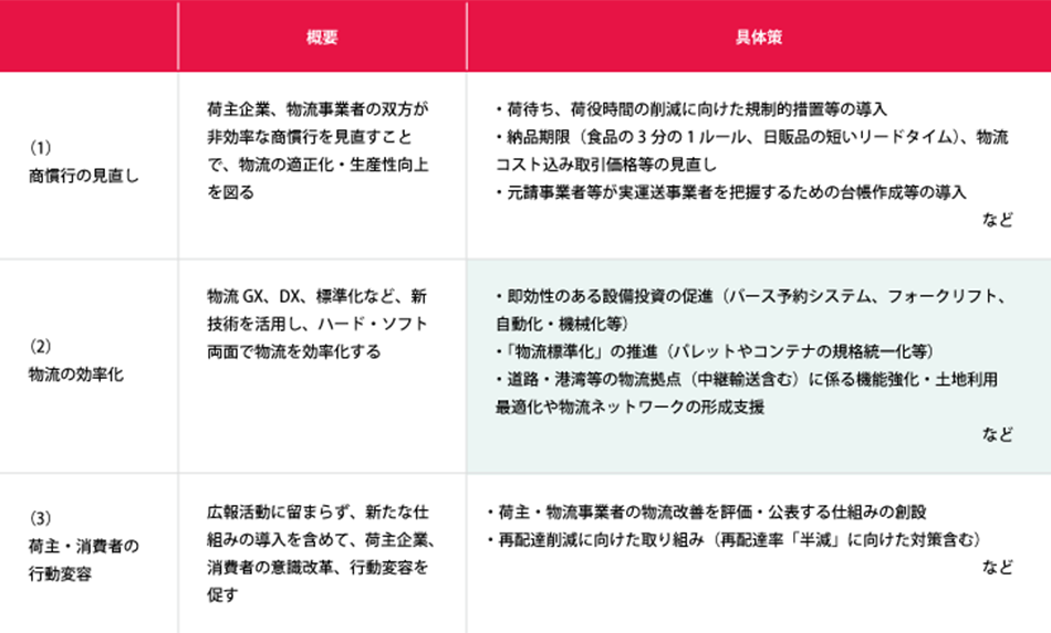 そんな物流クライシス(危機)とも呼ばれる状況を避けるため、政府は2023年6月2日に「物流革新に向けた政策パッケージ」を決定し、(1)商慣行の見直し、(2)物流の効率化、(3)荷主・消費者の行動変容に取り組むことを表明しました。