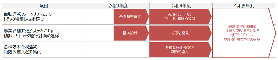 その結果、2021年9月16日に、この実証事業において荷役効率化・物流効率化・省エネ化に取り組む提案が採択され、大和ハウス工業株式会社、イオングローバルSCM株式会社、花王株式会社、ロジスティード株式会社、株式会社豊田自動織機のサプライチェーン5社による共同事業が交付決定されました。