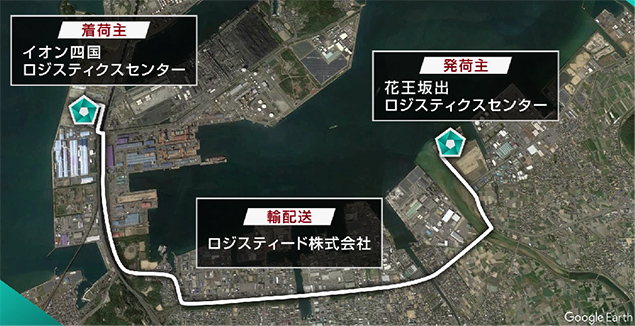 香川県の花王坂出ロジスティクスセンターからイオン四国ロジスティクスセンター(Dプロジェクト坂出B棟)への輸配送を対象に、実際の注文情報や商品を用いて実証実験を行いました。