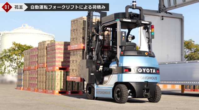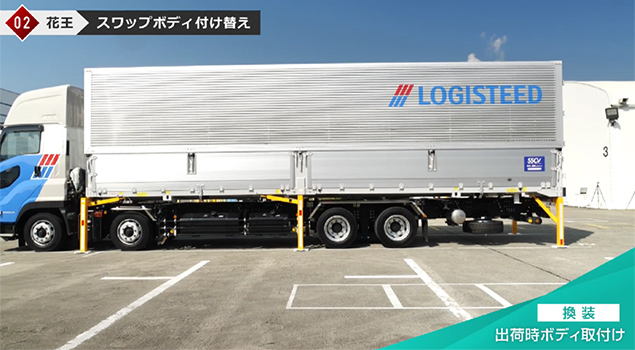 花王の物流センターでトラックが到着する前に、自動運転フォークリフトでスワップボディコンテナに荷積み作業を完了させておきます。