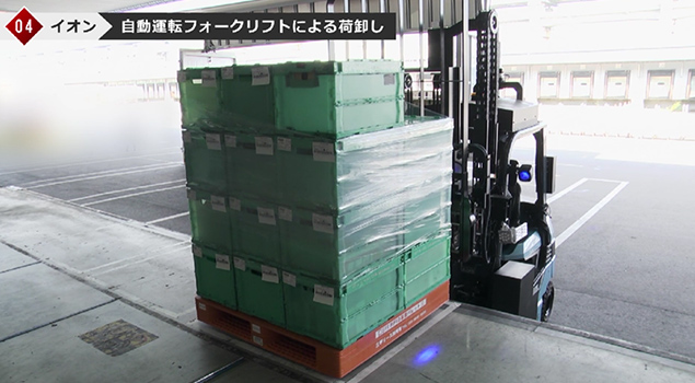 自動運転フォークリフトが、運ばれてきたコンテナから倉庫のプラットフォームへ荷卸し作業を行います。