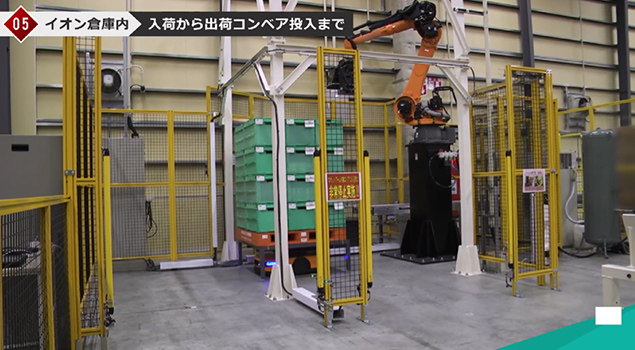 プラットフォームに置かれたパレットは、屋内用のAGFで垂直搬送機に積まれ、2階に上がった荷物は、2階の別のAGFが運びます。デパレタイズエリアまで運ばれた商品はロボットでコンベアに投入され、出荷ゾーンまで運ばれます。