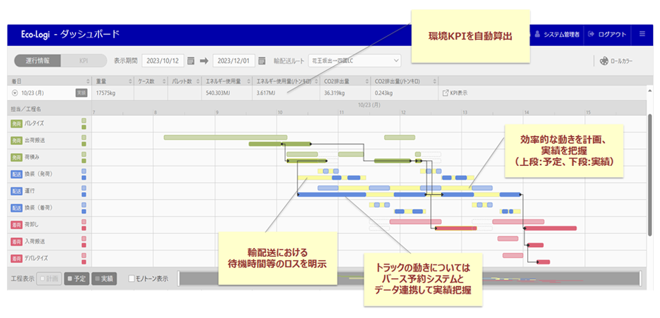 事業者間で輸配送に関する計画と実績を共有するシステムを開発。情報を共有することで、より効率的な計画を立案可能で、実績や各種のKPIを一元的に把握することができます。