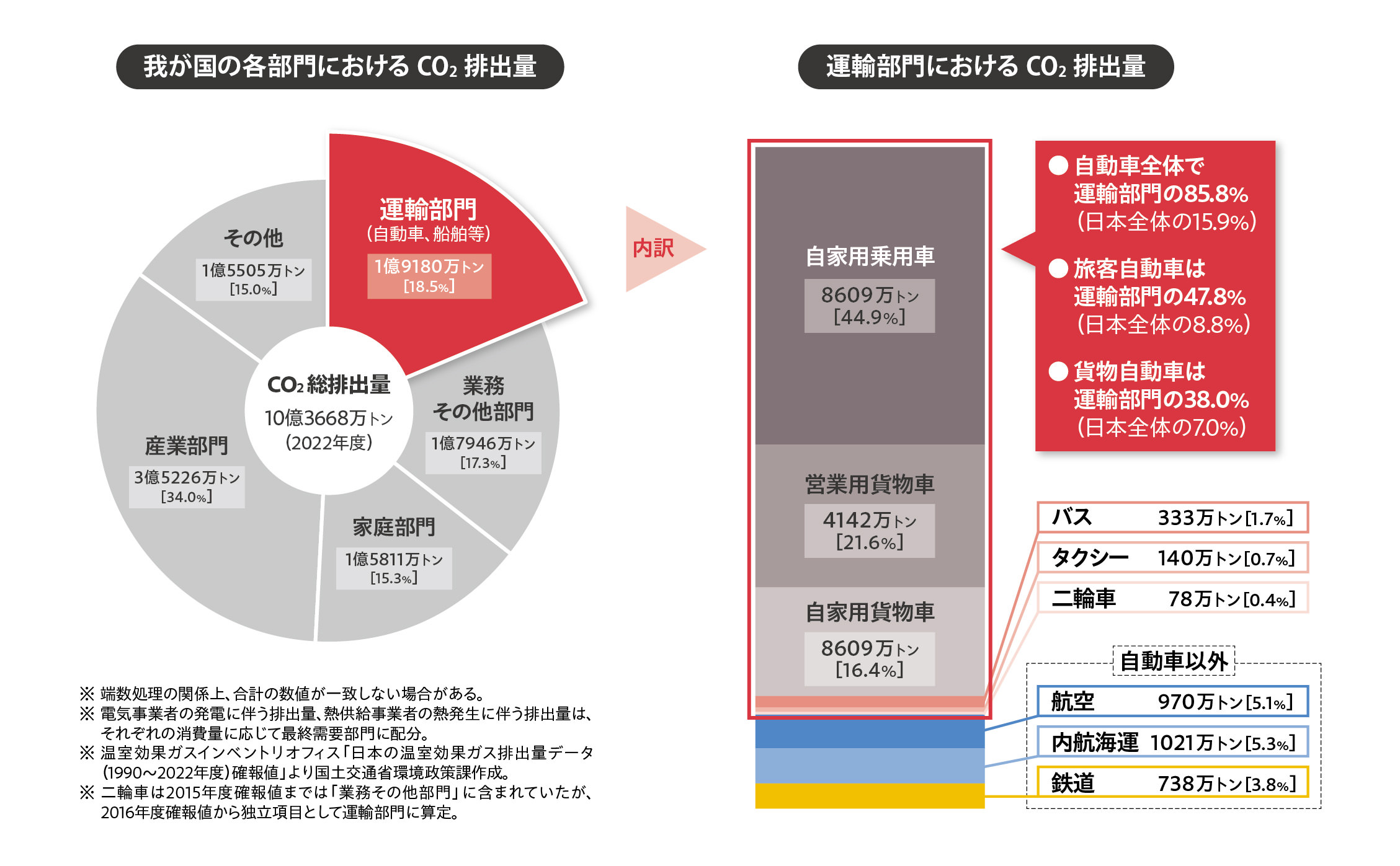 トラック輸送には環境負荷の問題もあります。国土交通省によると、2022年度における日本の二酸化炭素排出量(10億3,700万トン)のうち、運輸部門からの排出量(1億9,180万トン)は18.5%を占めています。自動車全体では運輸部門の85.8%(日本全体の15.9%)、うち、旅客自動車が運輸部門の47.8%(日本全体の8.8%)、貨物自動車が運輸部門の38.0%(日本全体の7.0%)を排出しています。