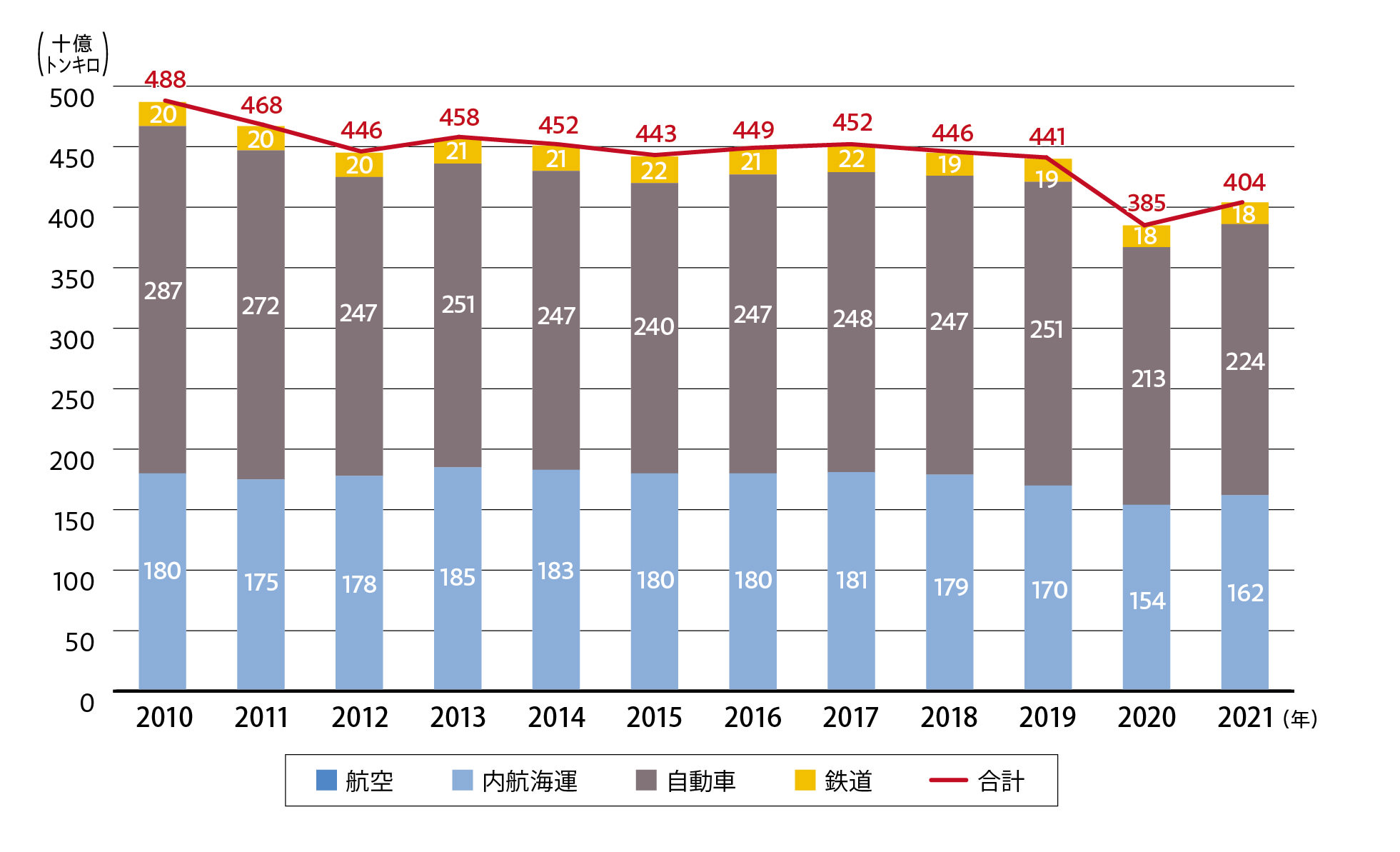 出典:国土交通省総合政策局情報政策本部「自動車輸送統計年報」「鉄道輸送統計年報」「内航船舶輸送統計年報」「航空輸送統計年報」より作成