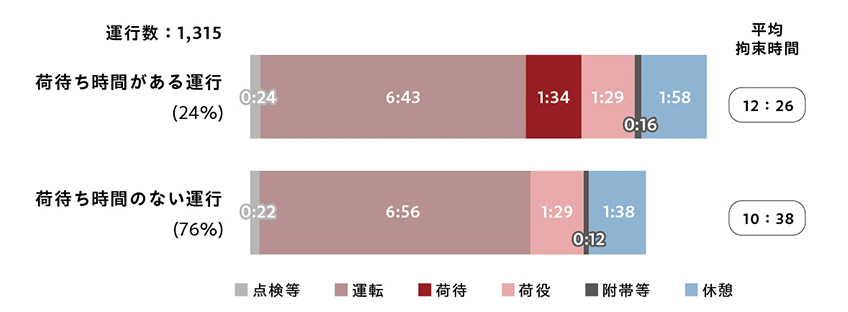 また、トラックドライバーの拘束時間に関して、荷待ち時間がない運行では10時間38分、荷待ち時間がある運行では12時間26分と、当然ですが、荷待ち時間がある運行のほうが、拘束時間が長くなっています。