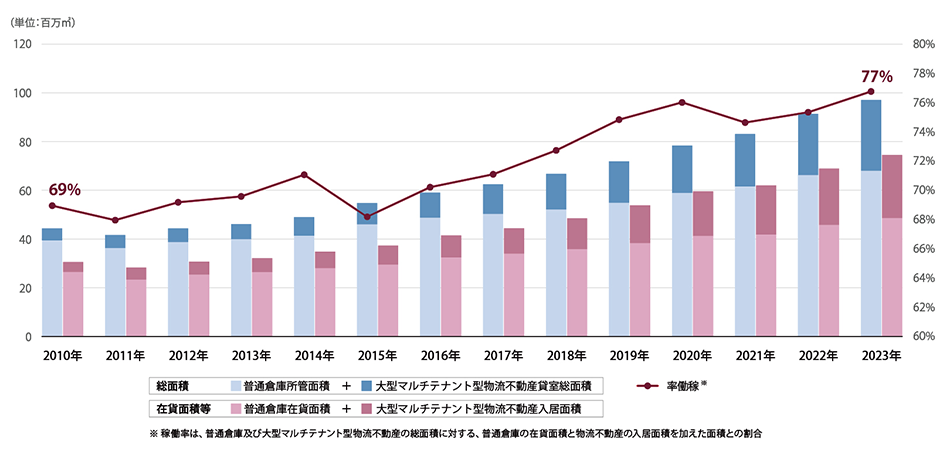 ※普通倉庫の在貨面積は貨物の保管量、大型マルチテナント型物流不動産は入居面積。BTS型物流不動産は含まれていない。また、普通倉庫と大型マルチテナント型物流不動産に係るデータには一部重複あり。