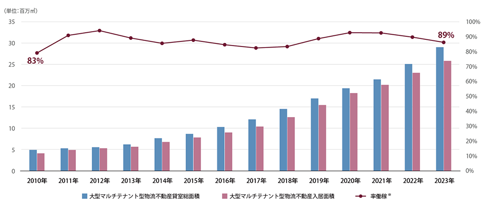 中でも、大型マルチテナント型物流不動産は、2000年初頭から大手国内ディベロッパーや外資系不動産開発会社等により、首都圏を中心に近畿圏や中部圏等で開発が進められており、2013年頃から急速に拡大が進みました。ここ数年の入居率は減少傾向にあるものの、2023年の貸室総面積は前年から10%以上の伸びを示しています。
