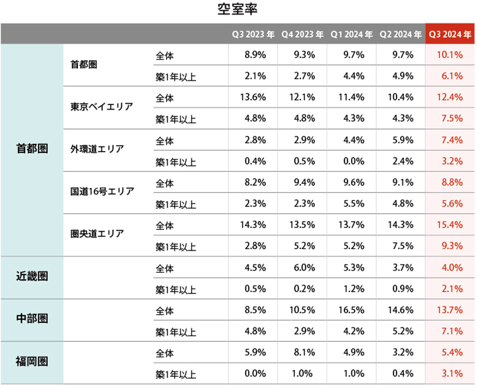 首都圏、近畿圏、中部圏、福岡圏においては、地域(条件)による差が広がっている傾向が見えます。首都圏においては、外環道エリア、国道16号エリアでは、空室率は一桁にとどまっていますが、圏央道エリアでは15.4%、東京ベイエリアでは12.4%と二桁となっており、地域による差が存在しています。ただし、外環道エリアは供給量の多さもあり、2023年第3四半期時点と比較すると2.8%から7.4%と空室率は上昇しています。