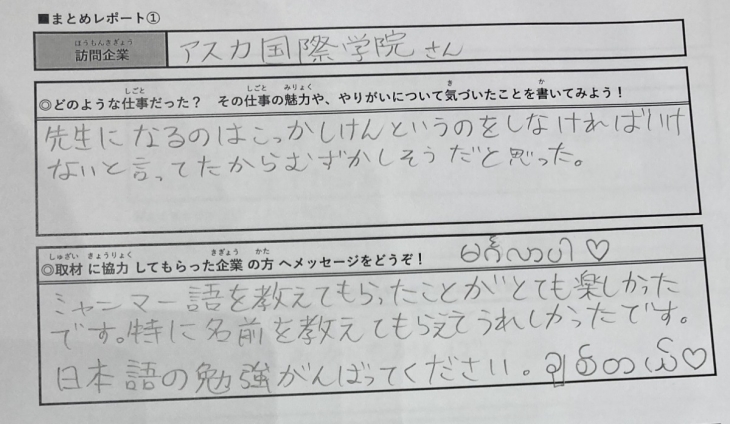 「取材先はどんな仕事だった?」「仕事の魅力ややりがいについて気付いたことは?」等、取材した企業・団体の皆さんのお仕事のお話や質問、体験を思い出しながらレポートに記入しました。