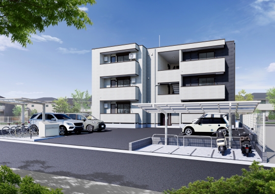 駐車場からの転用事例です。階段室タイプで、採光・通風・プライバシーを確保しながら、収益の効率性が高いプランを実現しました。対面キッチンや一坪タイプの浴室、ペット可仕様、宅配ボックス、蓄電池など、ご入居者に喜ばれる仕様・設備を充実。敷地内にバイク置き場も併設しています。環境配慮型のNearly ZEH-M仕様も、ご入居者満足度を高めるポイントです。