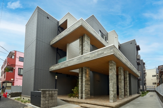 駐車場からの転用事例です。重厚感のある外観と、敷地を効率よく活用して収益力の強化を図ったプランが当会場の特徴です。住戸は1LDK×13世帯+2LDK×8世帯の構成で、一部の部屋では2600mmのキッチン、1坪タイプの浴室を採用しています。環境にやさしく経済的な暮らしが叶うNearly ZEH-M仕様で、ALSOKホームセキュリティも搭載した防犯配慮型の賃貸住宅です。