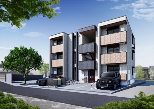 バルコニーは袖壁を用いて躍動感を感じさせるシルエットに。新色のオーダリーブラックを使った2本の柱が建物のファサードを引き締め、温かみの中にクールな一面を感じさせる配色が印象的です。