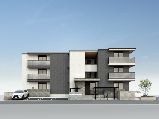 交差点に向けてコーナーバルコニーや植栽を設け、意匠にこだわり角地の特性を生かして全世帯駐車場1台完備した効率の良い配置計画です。