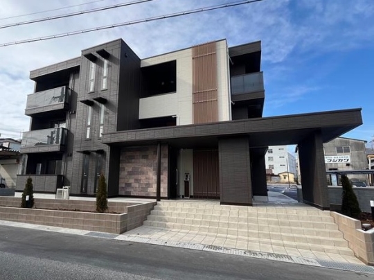 通りに面して設けたゆとりあるエントランスは木調ルーバーやタイルを用いた特徴的な仕上がりです。建物は高断熱で省エネ設備を採用したZEH-M Oriented仕様の環境配慮型賃貸住宅です。