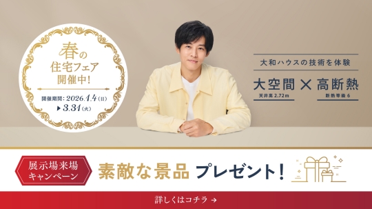 2026年1月4日〜3月31日の期間中、大和ハウスの公式WEBサイトから「住宅展示場」にご予約の上、ご来場いただいた方には素敵な景品をプレゼントします。詳細は各展示場にお問い合わせください。