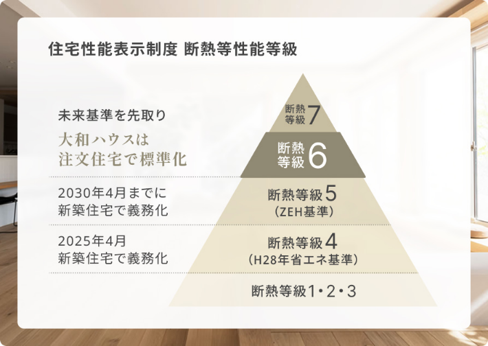 2050年までにカーボンニュートラル実現を国が推進する中、高断熱住宅の重要性が高まっています。2030年にはZEH基準の「断熱等級5」が義務化される予定です。そこで大和ハウスはさらに先を見据えて「断熱等級6」を標準化。未来基準の住まいをお届けすることが大切だと考えています。
