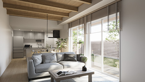 LDKは大開口の窓から光が差し込み、心地よい時間を過ごせます。ウォークスルークローゼットは家族全員の物を1カ所で管理でき、家の中がすっきり。「窓レス」の水回り、「扉レス」のクローゼットが掃除や片付けの手間も減らします。