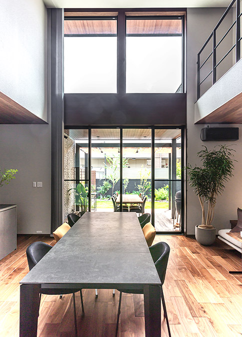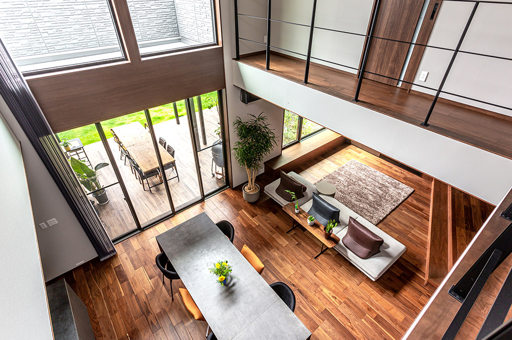 大きな吹き抜けのあるダイニングスペースは、上下階に連続する大開口から視界が広がり開放的。窓外には広々としたテラスが続くので、内外を一体的に使って大人数で賑やかに食事することもできます。また、上下階の窓をつなぐ小壁は木目柄の化粧材を施し、上下の窓をひとまとまりに見せています。