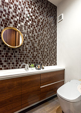色柄にリズム感のあるモザイクタイルを壁一面に施した、華やかな印象のトイレ。ゴールド枠のラウンドミラーがアクセントとなり、一層雰囲気を高めています。