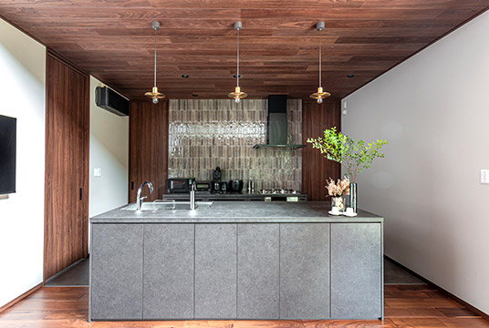 マットな質感の落ち着いた空間に、艶やかなタイルが映えるキッチン。小ぶりなペンダント照明がタイルの存在感を引き立てながら温かな灯りを加えています。扉奥に大容量パントリーが続き雑多なものが表に出ないので、いつでもすっきりと美しいキッチンを保つことができます。