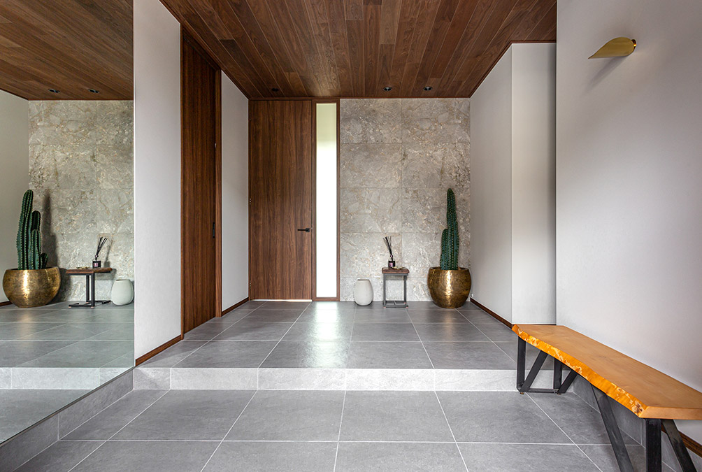 石目柄タイルとウォルナットの素材感が調和する玄関。タイル張りの床は土間からホールまで連続し、さらに柄のニュアンスを変えて壁のタイルへ続きます。左手の存在感あるミラーは姿見だけでなく、奥行と広がりをもたらす空間的役割も。さらに扉横のスリット窓から光を取り込むことで、扉向こうの開放感を期待させます。