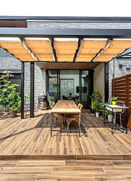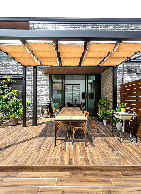 ダイニングスペースとつながる広々としたテラスには、大人数が座れるテーブルを設置。外の開放感と、室内のような落ち着きを併せ持ち、大人数を招いた際もゲストに心地良く過ごしてもらえます。