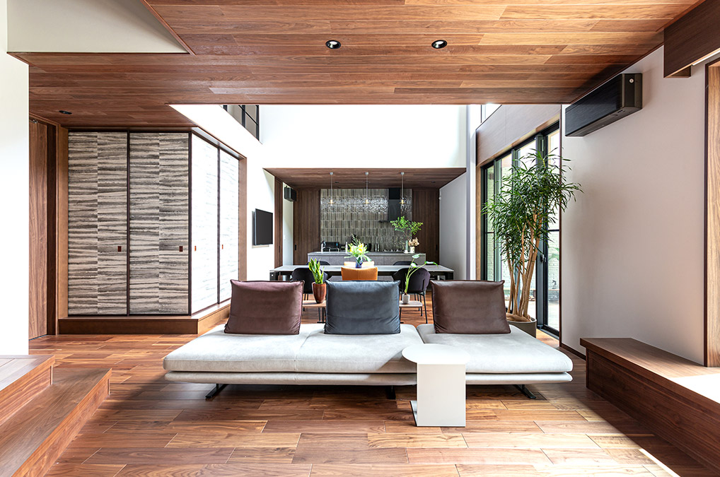 ゲストを招いて得意の手料理を振る舞う賑やかなひとときも、家族が思い思いに過ごす静かな時間も、どちらも心地良く過ごせるAさまのご新居。ダイニングキッチンは大きな吹き抜けと、窓外に広がるテラスによって開放感あふれる空間に。キッチンを囲んで談笑しながら料理をしたり、テラスで食事を楽しんだりと、豊かな暮らしの情景が浮かびます。一方、階段につながるリビングは、ゆとりのあるステップやヌックがあることで落ち着く居場所に。タイルやウォルナットの素材と色味が上質感を醸し出し、静かな寛ぎの空間となっています。