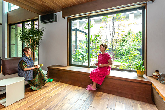 階段ステップは窓前のベンチまで連続し、リビングを囲むように、どこでも気軽に座ることができます。ひとりでも大人数でも心地良い居場所となり、窓外の緑を身近に感じながら自然体で寛げます。