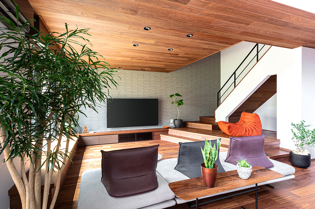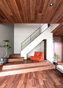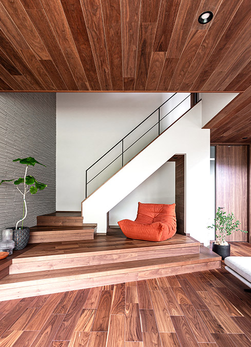 階段スペースからゆったりと広がるステップが、階段とリビングの間に高さのグラデーションをつくり、味わい深い居心地を生み出します。ステップはテレビボードやベンチの役割も担う、すっきりと一体感のある空間です。また、吹き抜け上部まで続くタイル壁が、木目柄と調和し繊細な表情を加えています。